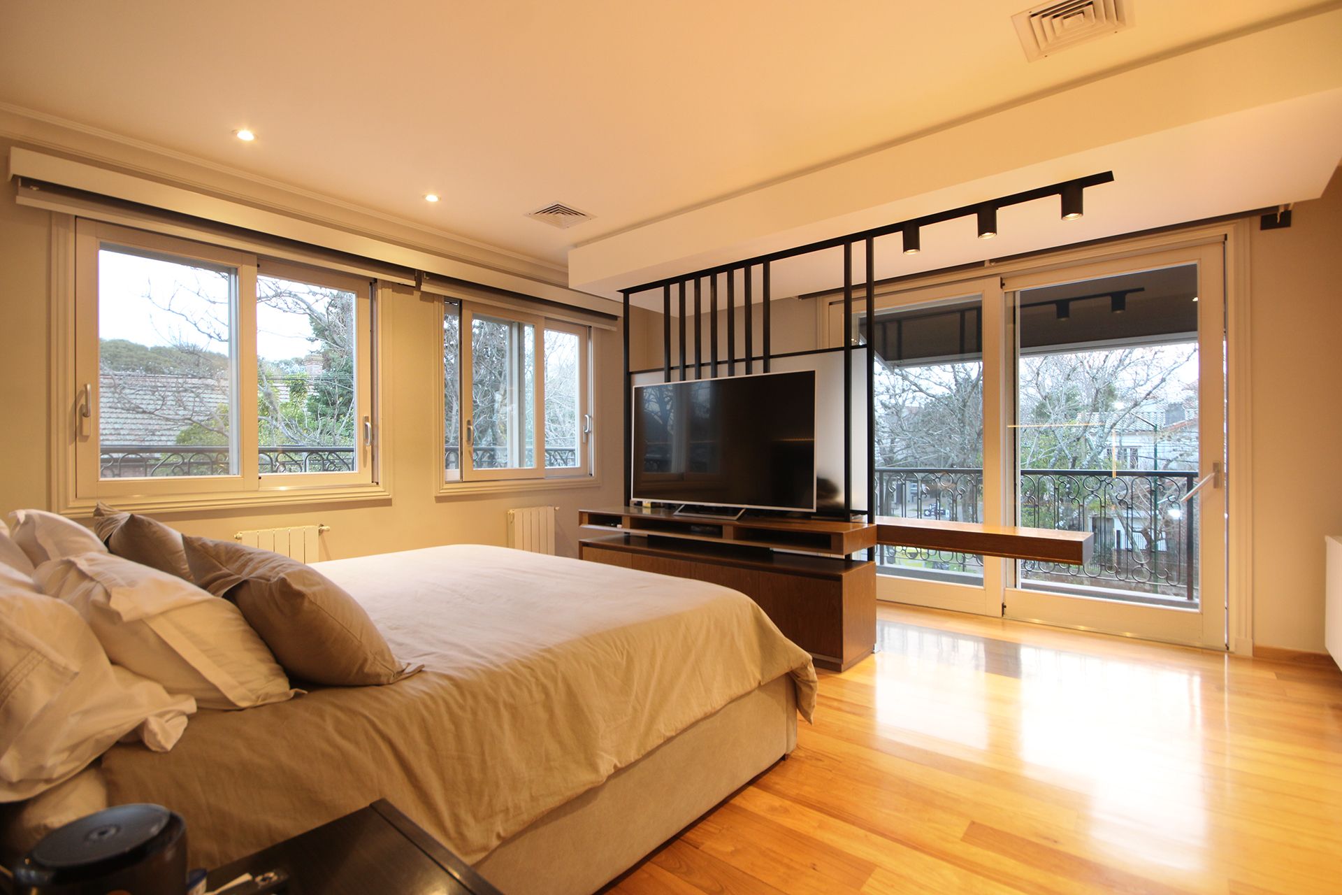 Con una superficie total de terreno de 495 m², la casa ocupa 430 m² cubiertos y cuenta con 75 m² semicubiertos. Se desarrolla en dos plantas más un subsuelo, y dispone de cuatro dormitorios en suite, cada uno con amplio ventanal, vestidor y acceso a balcón. El dormitorio principal, ubicado al frente, incluye un vestidor amplio y un balcón privado. Las demás suites presentan espacios amplios, vestidores y balcones corridos, con grandes placards y, en uno de los casos, un escritorio integrado.