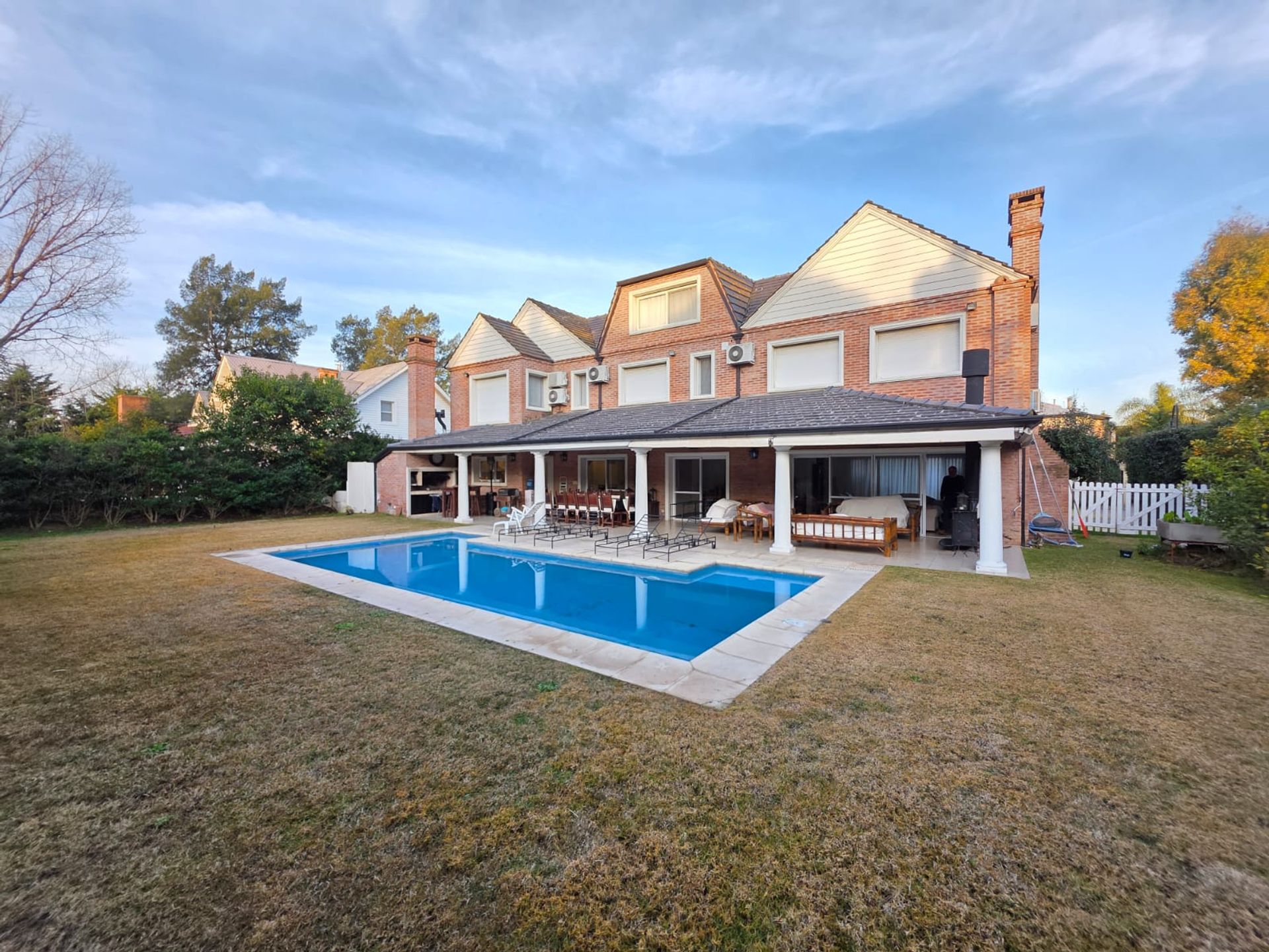 En la planta baja se encuentra un hall de recepción que conduce a un comedor diario, a un living con hogar y a otro sector de estar, ambos con salida a la galería. La cocina, amplia y funcional, cuenta con isla, anafe industrial y muebles de altura bajo y alto mesada, mientras que un lavadero independiente y una dependencia de servicio con baño completan el espacio. La entrada imperial se enmarca entre dos palmeras y dispone de un estacionamiento cubierto para un auto y siete plazas descubiertas.