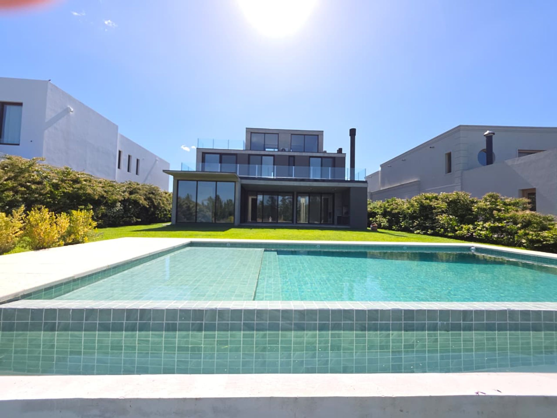 El exterior cuenta con una amplia galería y un jardín al lago, parquizado con riego automático, grama bahiana y plantas perimetrales. La piscina, revestida con venecitas, se complementa con un solarium que invita al descanso y la recreación al aire libre.