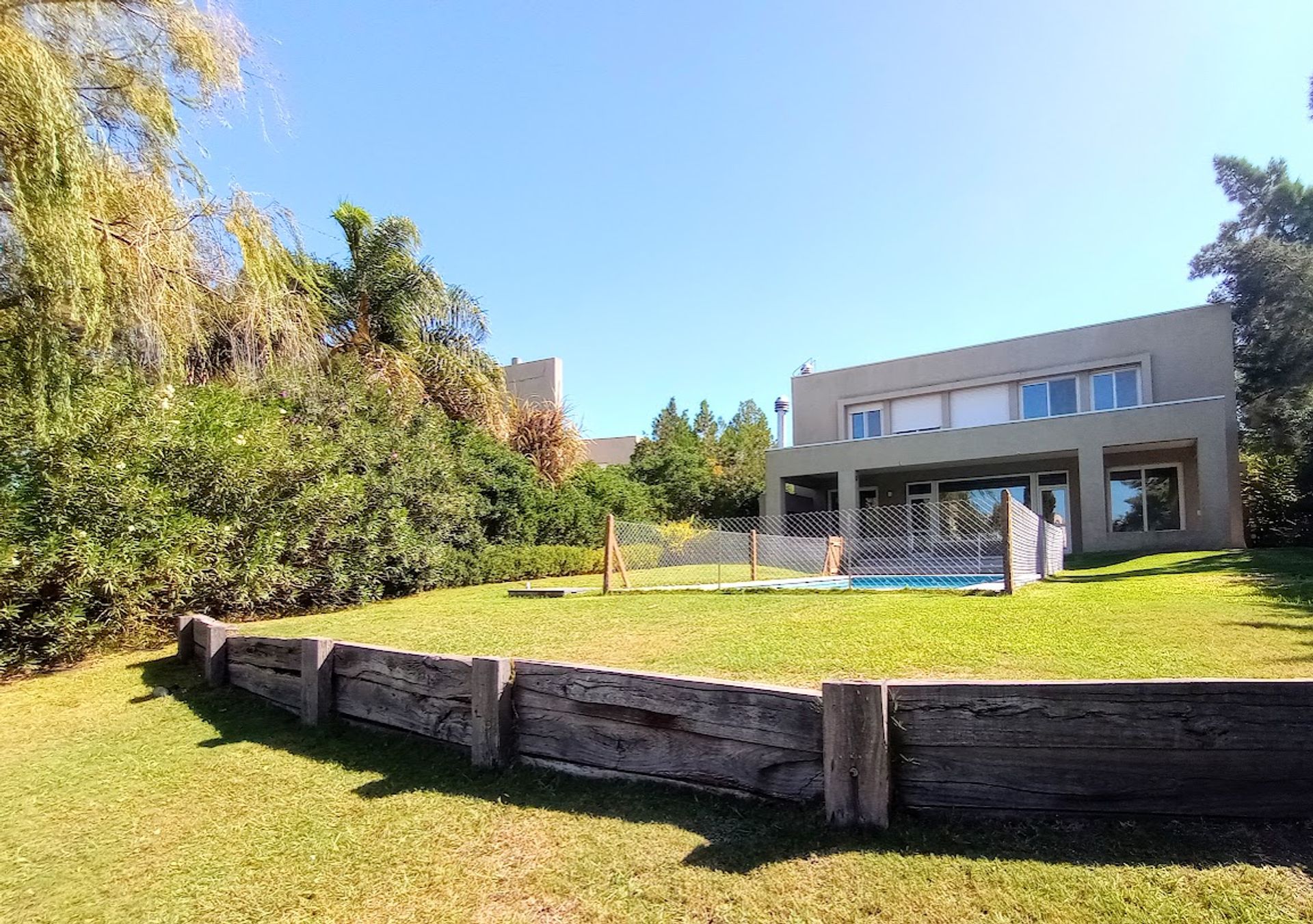 La casa está alquilada hasta febrero de 2026. En la planta baja se ubica un hall de entrada, un toilette y un dormitorio o escritorio en suite con baño completo. Un amplio living comedor, orientado al jardín, se abre a la galería exterior. La cocina es independiente, con un lavadero amplio. En la planta alta se encuentra un playroom de gran extensión, dos dormitorios semi suite que comparten un baño completo y el dormitorio principal con antesala, vestidor y baño compartimentado, con ventanal que ofrece una vista panorámica de la laguna. El dormitorio de servicio cuenta con baño completo y acceso independiente desde el exterior.