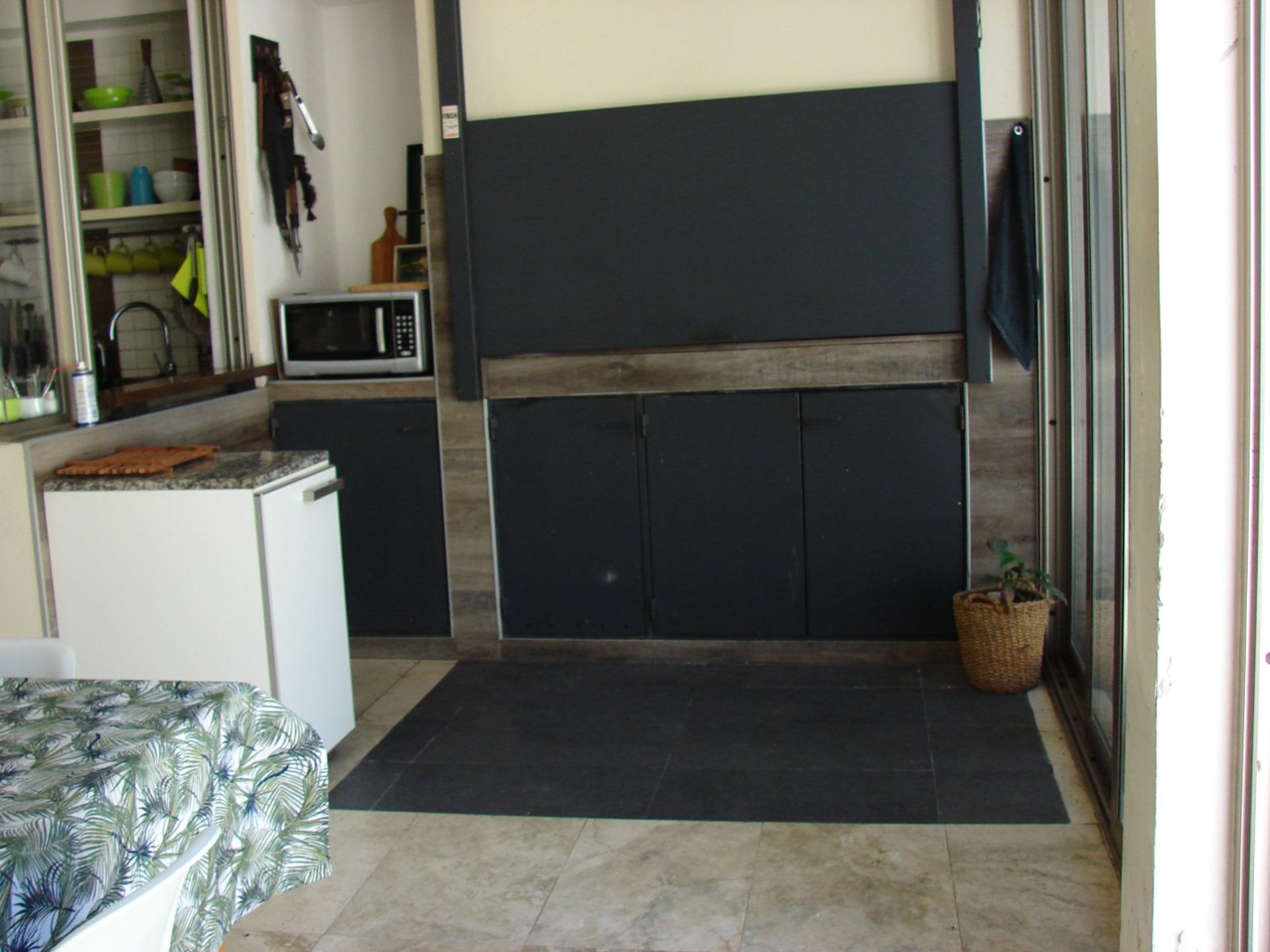 En el interior se distinguen pisos de travertino, escaleras con peldaños de madera y estructura de hierro, resaltando la robustez constructiva. El amplio living comedor se abre al jardín de ingreso, mientras que la cocina, con barra desayunadora, conduce a un quincho cubierto con parrilla. En el patio trasero se encuentra una pileta de líneas modernas, lateralmente rodeada de césped y arboleda, y un departamento de servicio con baño completo.