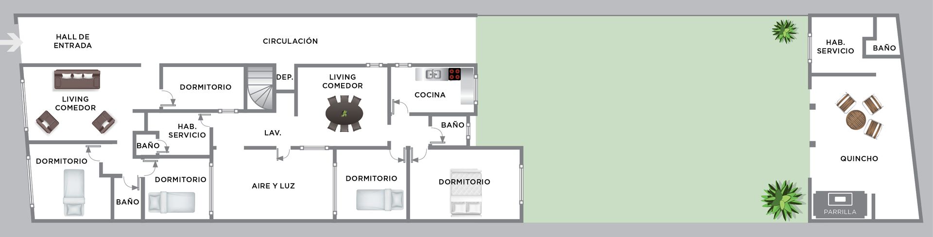 Entre los espacios exteriores, destaca un patio interno y un jardín encantador que conduce a un área de quincho con parrilla. A su lado se encuentra una habitación de servicio con baño independiente y lavadero, ideal para la comodidad de la familia o para invitados.