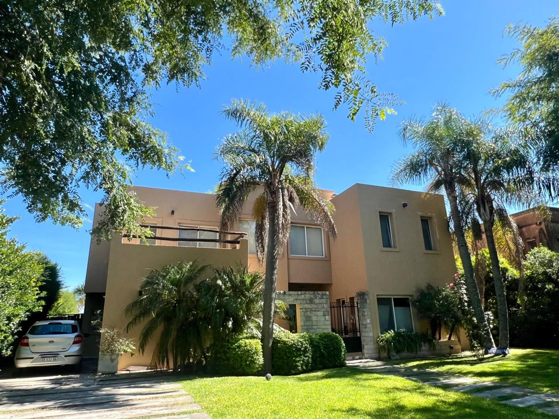 Al ingresar, un camino con vistas panorámicas a la laguna conduce a una entrada que acoge varios vehículos. La planta baja combina funcionalidad y estilo: un hall de acceso abre a un amplio living-comedor con chimenea, perfecto para reuniones familiares. La cocina, equipada con isla y comedor diario, complementa la zona de convivencia. Un pequeño toilette y una dependencia de servicio con baño completo y doble ingreso facilitan la vida diaria, mientras que el lavadero está estratégicamente ubicado. Una galería con parrilla y toldos eléctricos invita a disfrutar de la terraza, y un jardín parquizado con césped, árboles y palmeras, irrigado por aspersión, crea un ambiente natural. La joya de este nivel es la piscina climatizada de 10 x 5 m, con dos playas húmedas y vista directa al campo de golf, ideal para refrescarse y entretenerse.