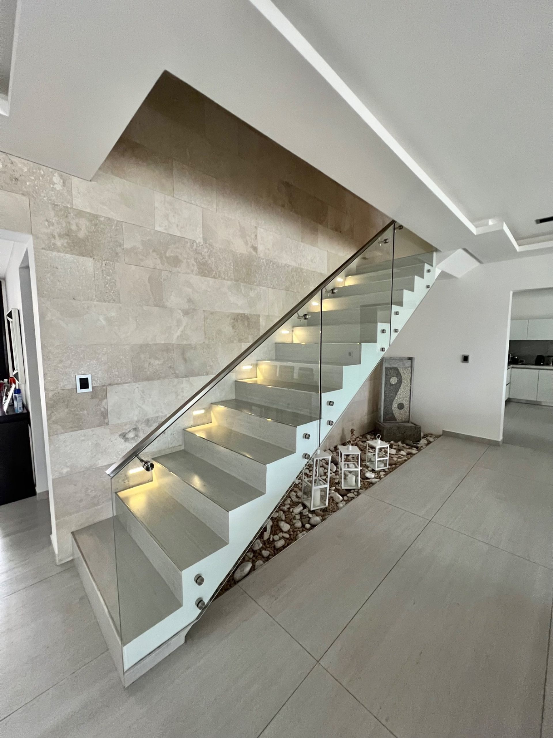 En la planta baja se encuentra un amplio hall de entrada que conduce a un gran living comedor y a una cocina con familia integrada, todos con vista al agua. Se dispone de un toilette, un escritorio con baño completo que puede funcionar como quinto dormitorio, una dependencia con baño ideal para huéspedes, un lavadero de gran tamaño y una cochera cubierta con espacio para dos autos y espacio adicional para varios vehículos.