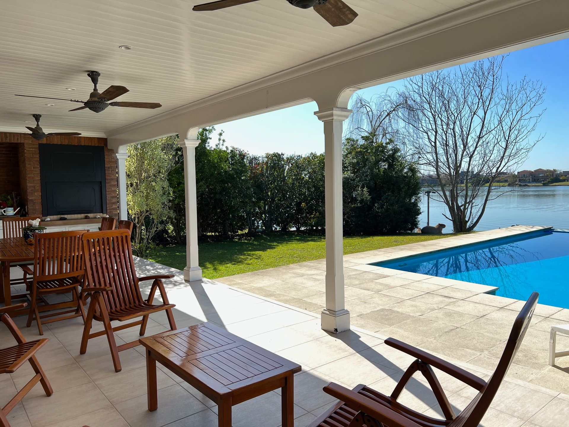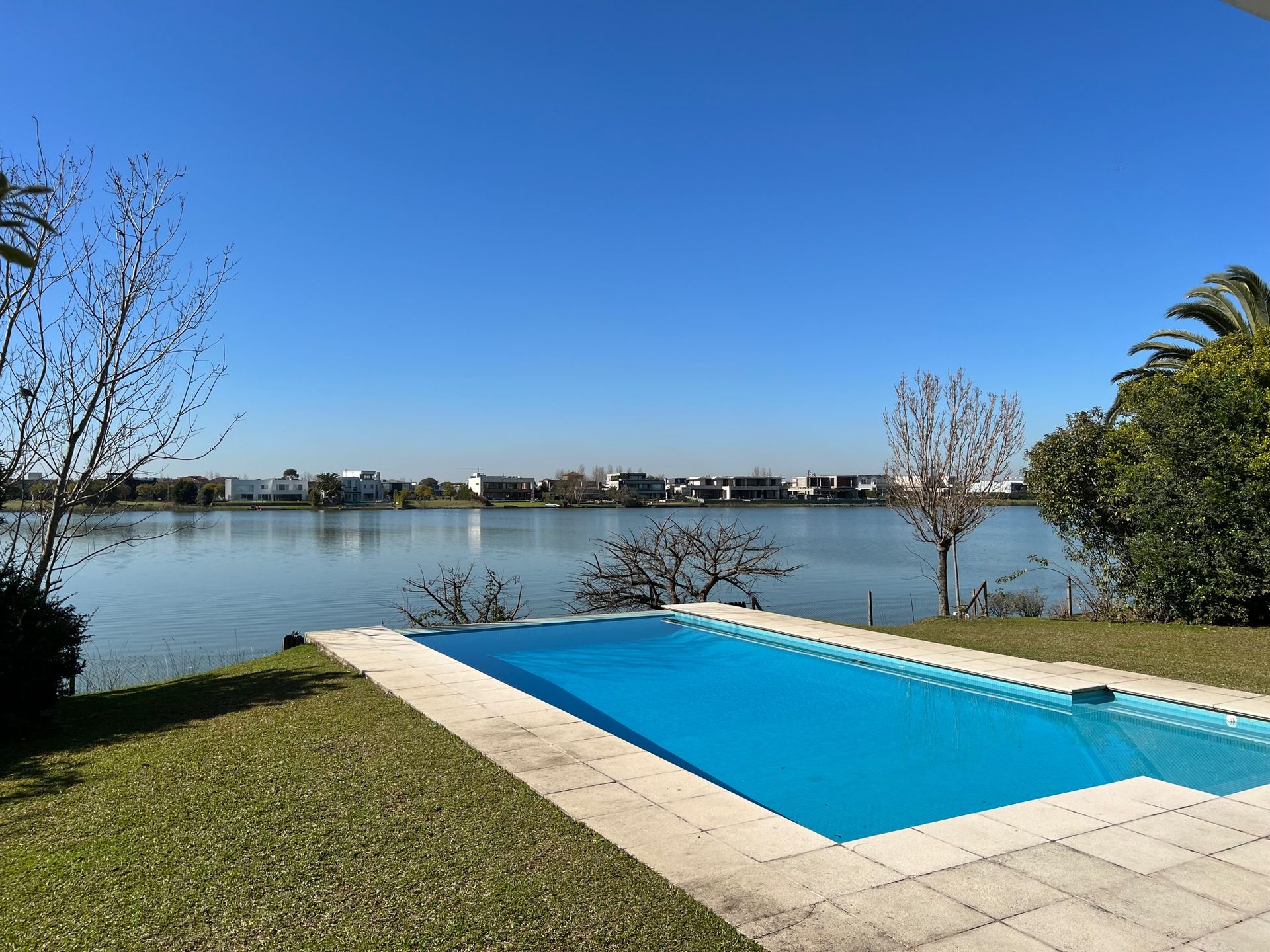 El exterior destaca por una galería con parrilla, un jardín espectacular con sistema de riego automatizado y una piscina revestida en venecitas que presenta un borde infinito hacia el lago, creando una sensación de inmersión en el paisaje acuático.