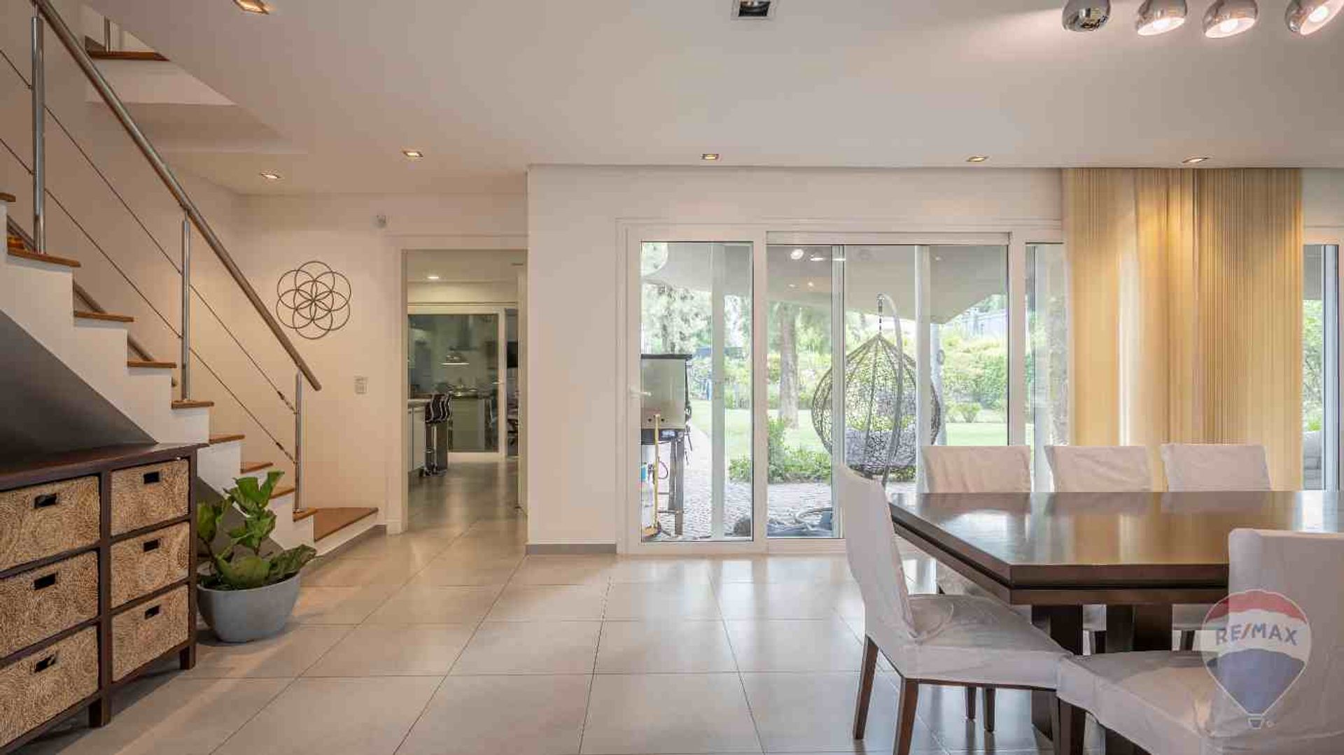 En la planta baja se abre un hall de entrada que conduce a un espacioso living y comedor con doble exposición, ambos lados con ventanas de piso a techo de PVC con perfiles VEKA. Un lateral da al jardín delantero y el otro al parque, donde diversos árboles proporcionan sombra y frescura. Una habitación o escritorio con vista al frente de la casa y un toilette de recepción completan el área de recepción. La cocina, equipada con isla, se conecta al quincho con parrilla, permitiendo una transición fluida entre el interior y el espacio gastronómico exterior. Un segundo escritorio y una dependencia de servicio con baño, amplio lavadero y abundante espacio de guardado están disponibles para la comodidad del hogar. La calefacción por radiadores se extiende a todos los ambientes. Un amplio garage cubierto, con portón motorizado, aloja dos vehículos grandes.