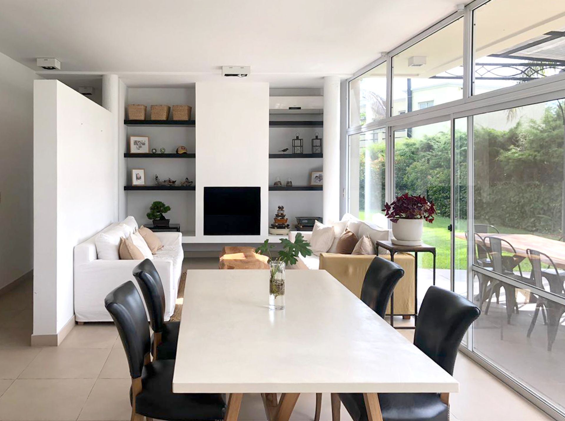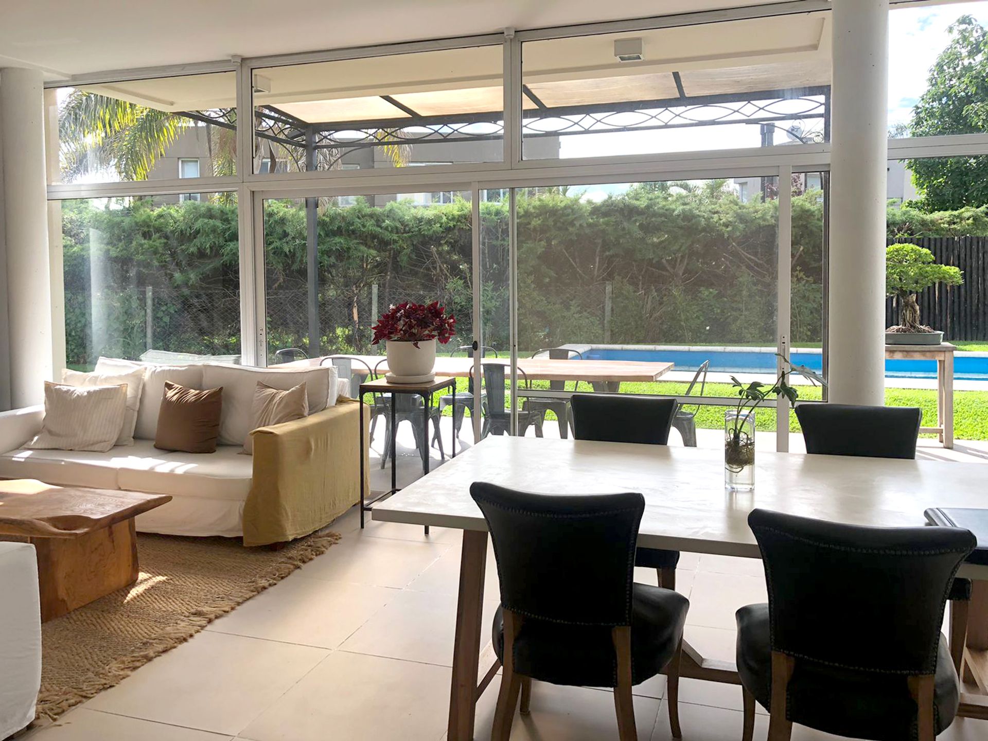 En la planta baja se accede a un hall de recepción que conduce a un amplio living con hogar, donde la iluminación natural se combina con una vista al parque. El comedor principal se integra al mismo espacio, creando un ambiente diáfano y acogedor. La cocina, abierta al living, cuenta con acabados modernos y funcionalidad plena. En este nivel se ubican una dependencia de servicio con baño completo, un toilette de recepción y un baño completo que sirve a los dos dormitorios.