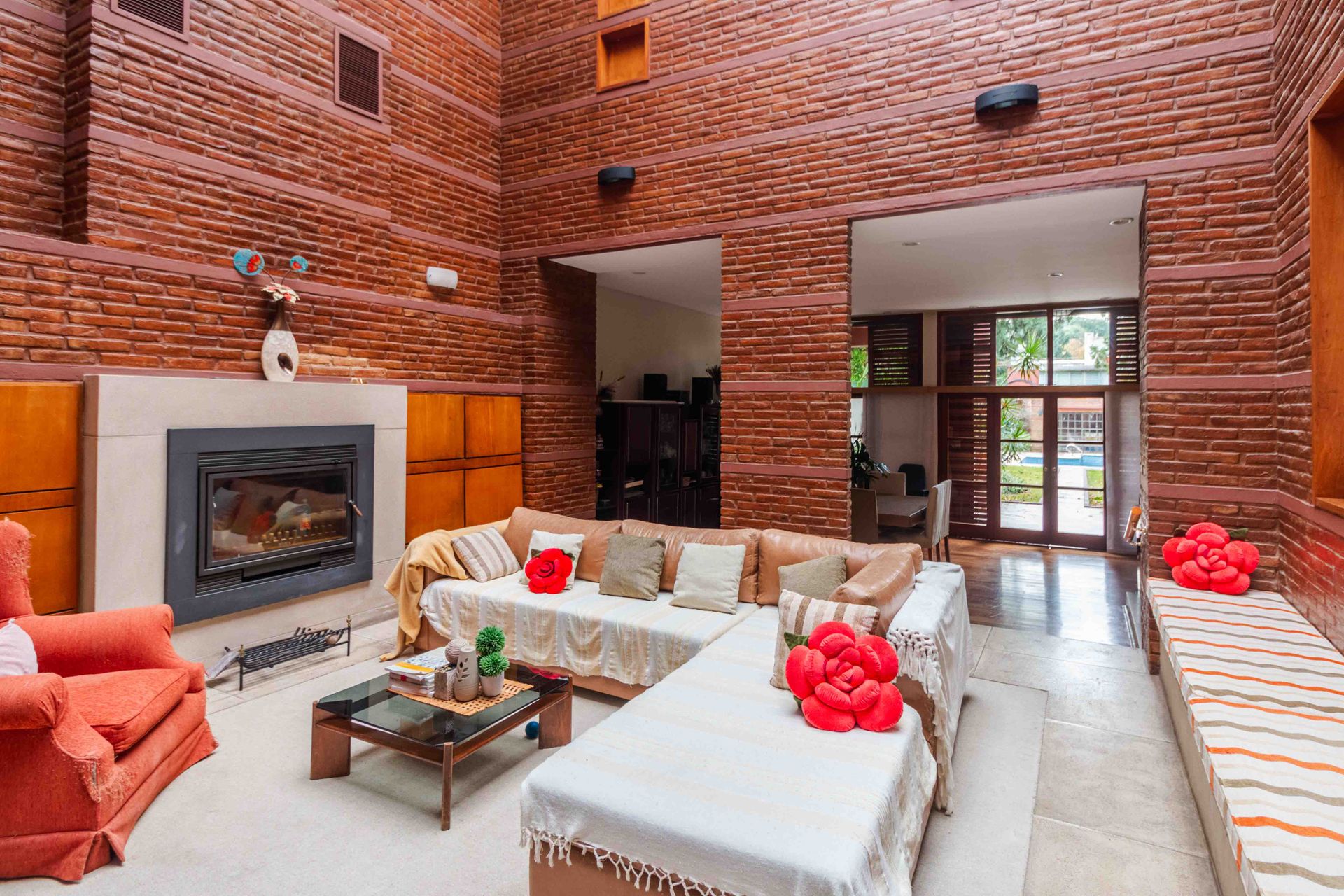 En la planta baja se destaca una sala de TV con persianas eléctricas y un living con desnivel, hogar a leña de tiraje natural y techo vidriado que inunda la estancia de luz natural. El comedor, con doble circulación, abre al jardín y a la cocina, la cual cuenta con doble mesada y acceso directo al patio. También se encuentra un cuarto de escritorio o cuarto dormitorio con placard y pisos tarugados, un toilette y una amplia galería o living externo. El jardín está decorado con una variedad de plantas, una piscina revestida con azulejos y un quincho equipado con parrilla, aire acondicionado y baño. Un horno a leña exterior complementa la zona recreativa.