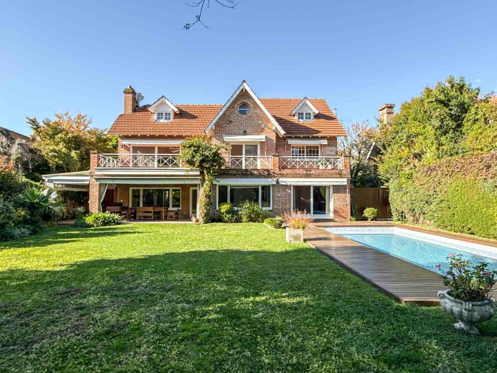 El primer nivel presenta un amplio living comedor con chimenea, escritorio y salida al jardín, todo sobre pisos de madera que aportan calidez. La cocina, recientemente refaccionada, cuenta con un diseño moderno, un comedor diario y un lavadero independiente, mientras que la toilette de recepción ofrece comodidad y estilo. El jardín, orientado al norte, cuenta con arboleda, una galería calefaccionada, parrilla con espacio de guardado y una imponente pileta revestida en venecitas con filtro y luz, creando un pulmón de relax y entretenimiento.