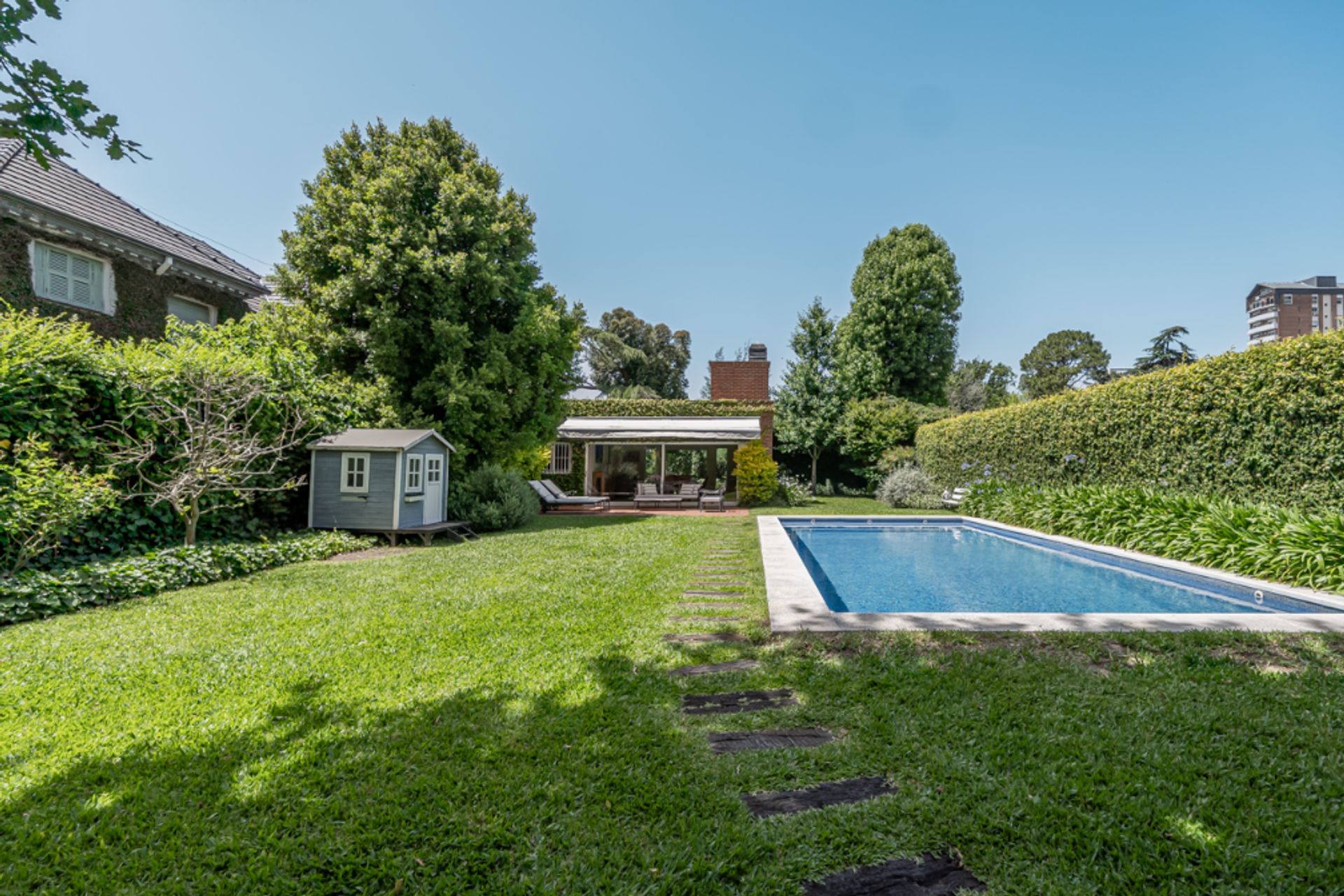 El jardín de 530 m², diseñado por la paisajista Cecilia Romanella, está rodeado de robles, tilo, dietes, salvias, rosales y canteros florecidos, ofreciendo diversos sectores de disfrute y espacios para reuniones. La piscina de 4,5 × 9,5 m cuenta con bomba y filtro automático. Un quincho cubierto de 50 m² incluye parrilla, horno industrial, mesada, bacha, baño con ducha y cuarto de herramientas, con termotanque independiente. Una galería lateral con toldo (solarium) y una zona de fogonero complementan la propiedad. Un espacio semicubierto permite la estacionamiento de dos autos.