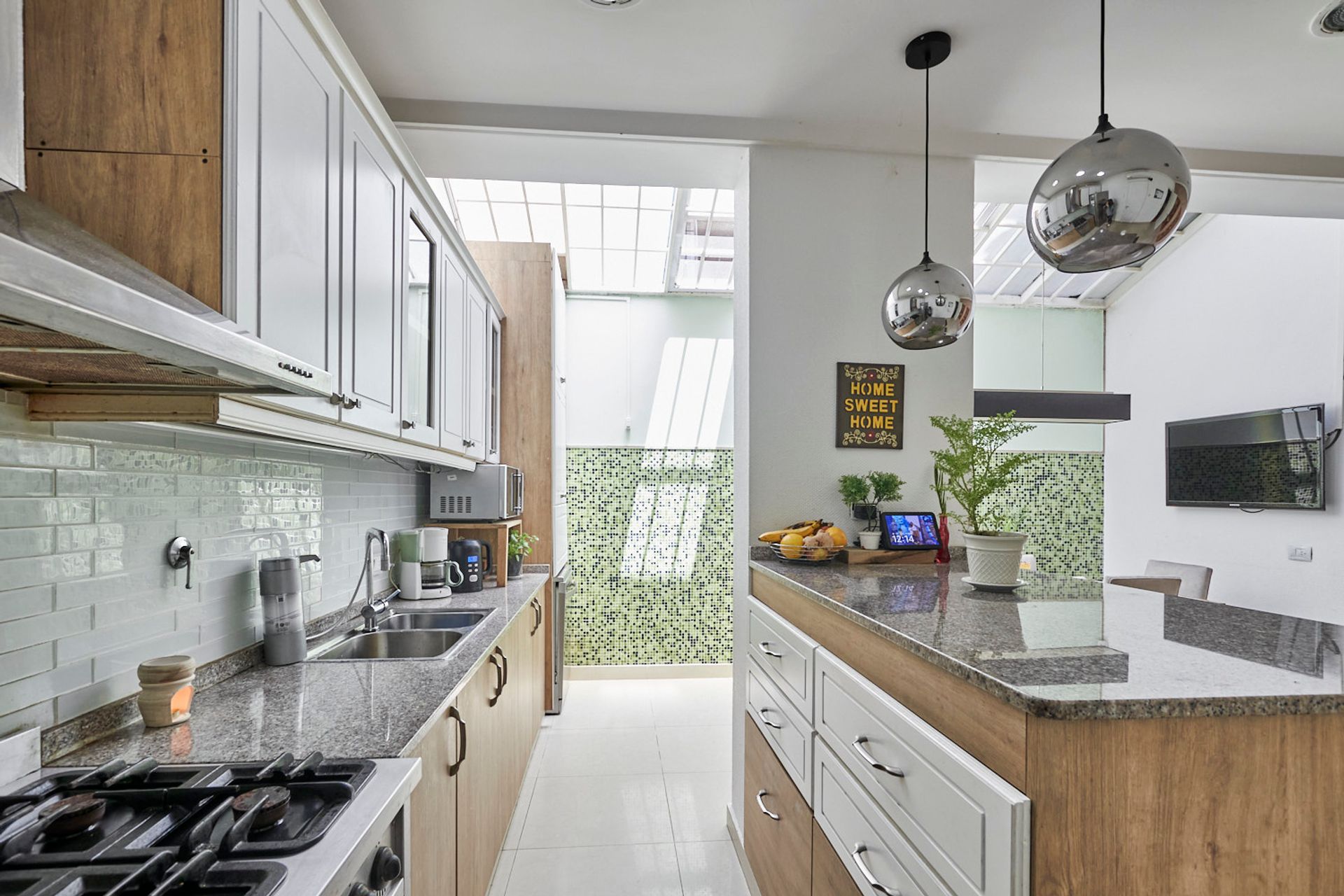 En la planta baja se abre un hall de recepción con escalera de madera que conduce a un amplio living luminoso. A la izquierda se encuentra un dormitorio con baño privado. La cocina, completamente renovada, cuenta con una isla de desayunos que la separa del comedor, todo bajo techo de vidrios templados que brinda gran luminosidad y ventilación. Además, dispone de un baño auxiliar con ducha. El garaje cubierto, con portón levadizo, se ubica frente a la calle FJ Sarmiento.