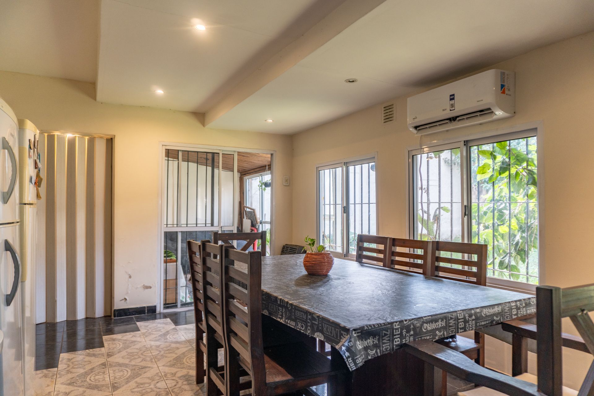 La distribución incluye dos dormitorios amplios y luminosos, cada uno con placard, y dos baños completos, uno en suite y otro externo. El living-comedor brinda vista al jardín y la cocina, amplia y moderna, cuenta con salida al exterior. El espacio verde del jardín mide 10 X 8, complementado por una galería semicubierta y un lavadero que también funciona como cuarto guarda herramientas y baño adicional.