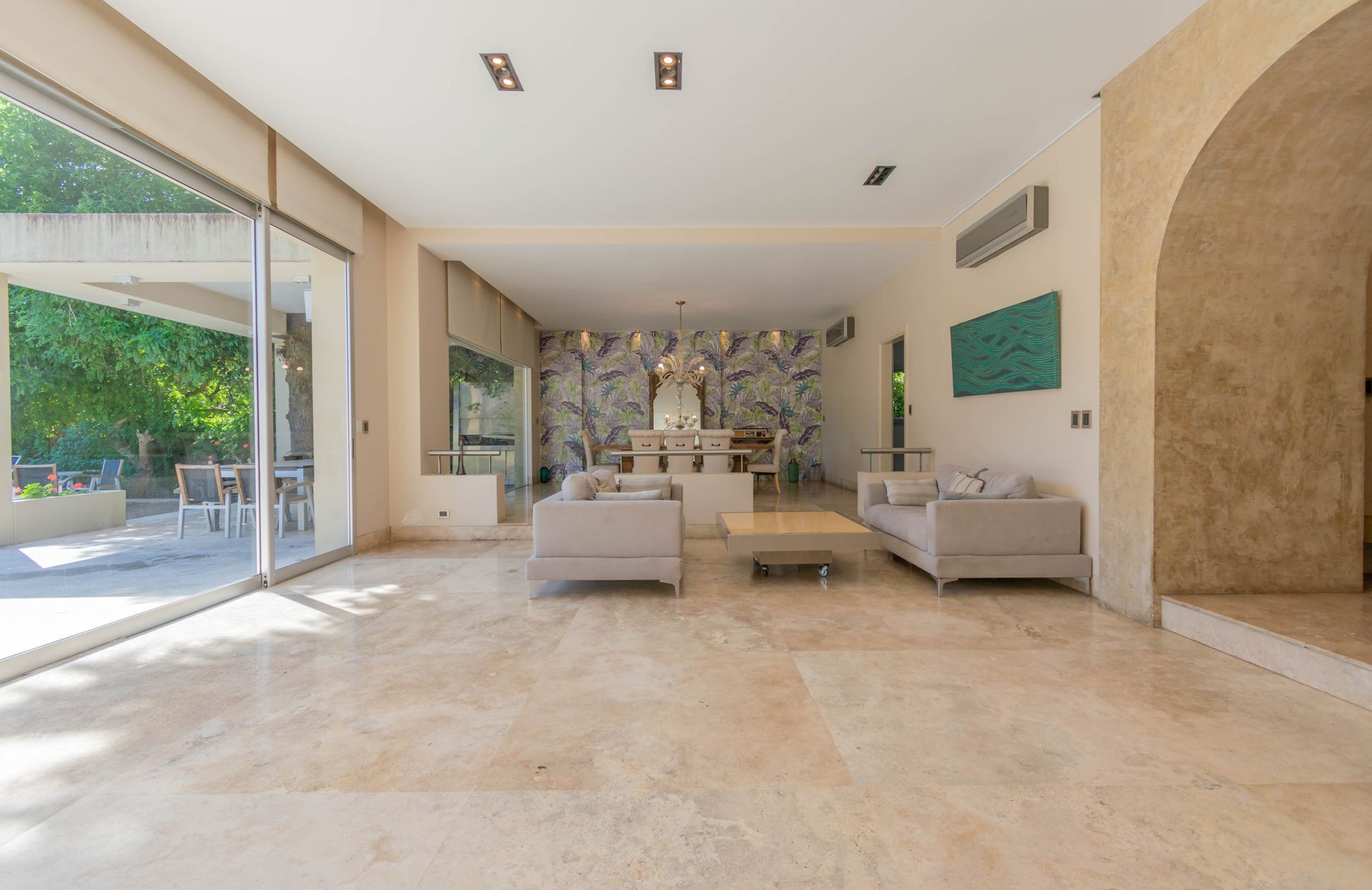 En la planta baja se abre un hall de recepción con recibidor y toilette. El gran living doble, luminoso y con ventanales que dan al jardín, se conecta con un amplio comedor principal que ofrece salida a la galería y vista a la piscina. La zona familiar cuenta con una sala de TV con vista a la galería. La cocina, amoblada con materiales de excelente calidad, dispone de despensa y se abre al comedor diario. Se encuentra una habitación de servicio con baño. El sótano alberga la sala de máquinas y un lavadero completo.