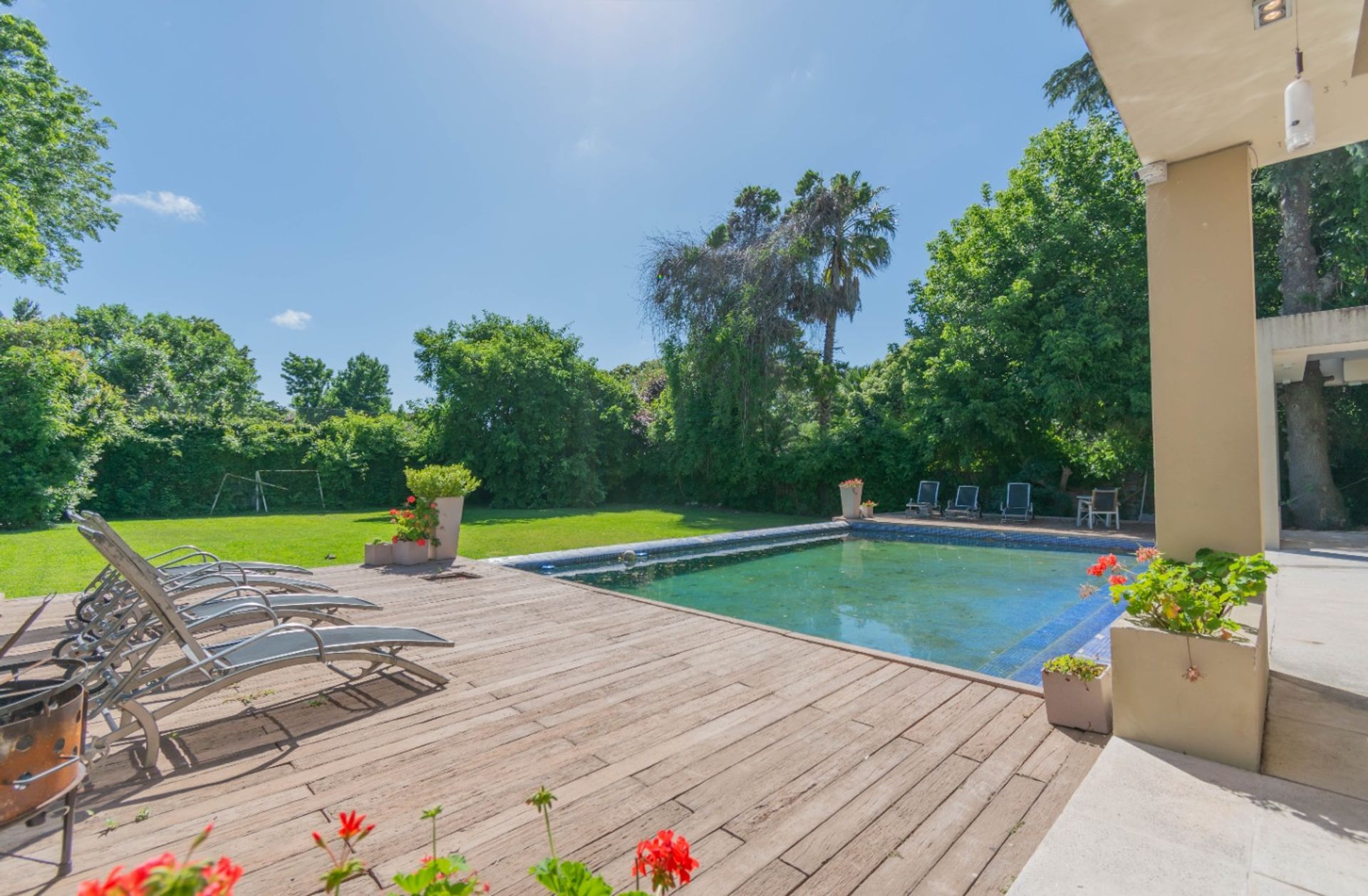 En la misma planta se ubica un dormitorio en suite con vestidor y baño completo, un espacio destinado a escritorio y otro a sala de juegos. La galería, accesible desde el gran living, conduce a la piscina recubierta con venecitas y a un solarium. El jardín, totalmente parquizado y con riego por aspersión, incluye una parrilla con mesada.