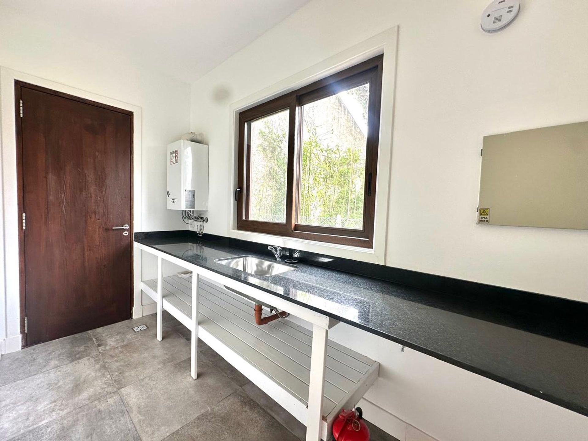 En el exterior destacan una galería con área de parrilla, un jardín de 762 m² y una cochera doble para estacionar dos vehículos. La vivienda incorpora calefacción central individual por radiadores y un sistema de aire acondicionado frío/calor en todos los ambientes. Las terminaciones son de alta calidad constructiva, con carpinterías de diseño contemporáneo y materialidades premium. Además, la orientación solar está optimizada para maximizar el confort térmico.