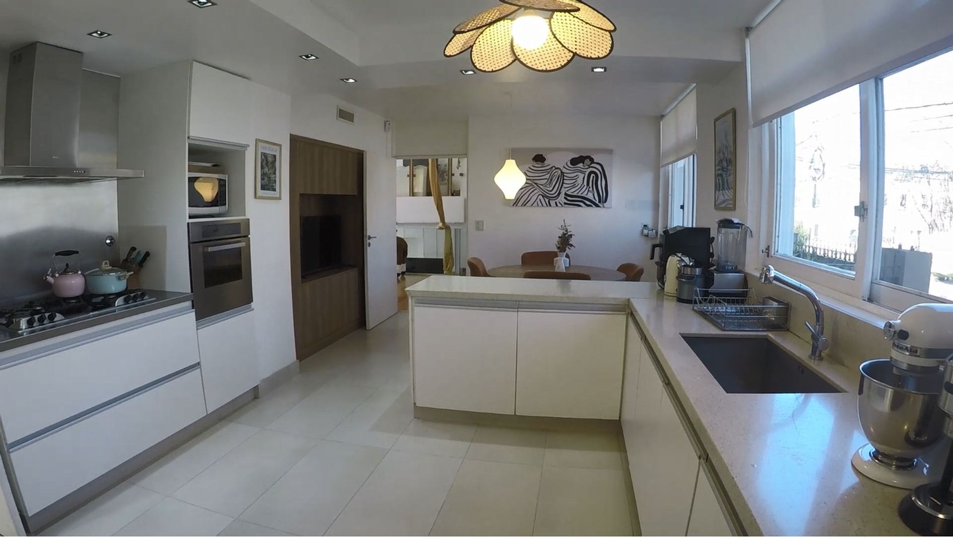 La cocina, con vista a Pedro Goyena, se integra con el comedor diario y un toilette propio, mientras que el amplio living, con hogar y comedor conectado, está totalmente vidriado y abre al parque privado. Un playroom, una sala de estar y un vestidor/oficina completan la distribución interior.