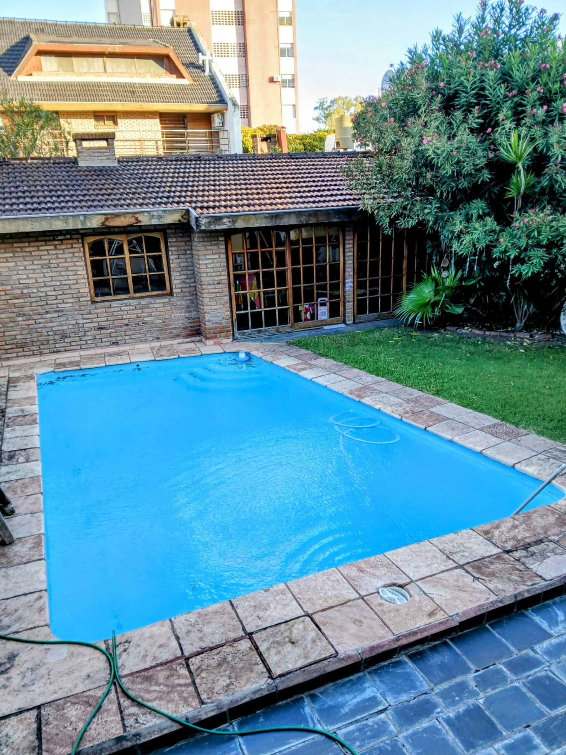 El exterior de la propiedad cuenta con un jardín amplio, una piscina y un quincho equipado con baño completo, creando el escenario perfecto para disfrutar del clima mediterráneo y las reuniones al aire libre.