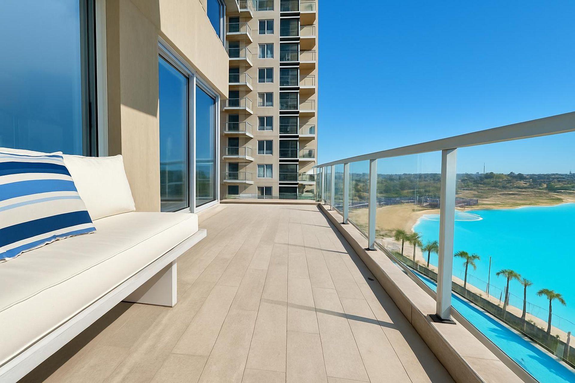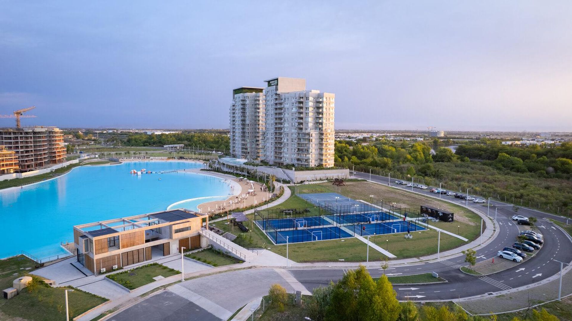 El complejo dispone de playa propia de 10.000 m², con un sistema Crystal Lagoon, perfecta para deportes náuticos. También incluye una gran piscina infinita en primer nivel, gimnasio wellness, área de open sports, bar y restaurante propio, cuatro canchas de paddle, una cancha de tenis, jardines para caminar y parrillas con sum y vestuarios. Además, la zona cuenta con lavandería, seguridad doble y estacionamiento con dos plazas fijas cubiertas y una baulera incluida.