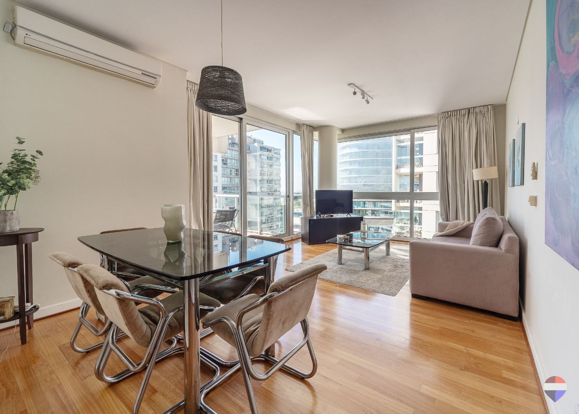 Los dos dormitorios en suite cuentan con placares de hojas corredizas, marco de aluminio y espejo. El mobiliario adicional, hecho a medida, brinda un óptimo lugar de guardado. En ambos baños se utilizan pisos de porcelanato y mesadas de mármol de Carrara. El aire acondicionado está instalado en splits, y la calefacción es radiante eléctrico individual por piso. El agua caliente se suministra de forma central las 24 horas.
