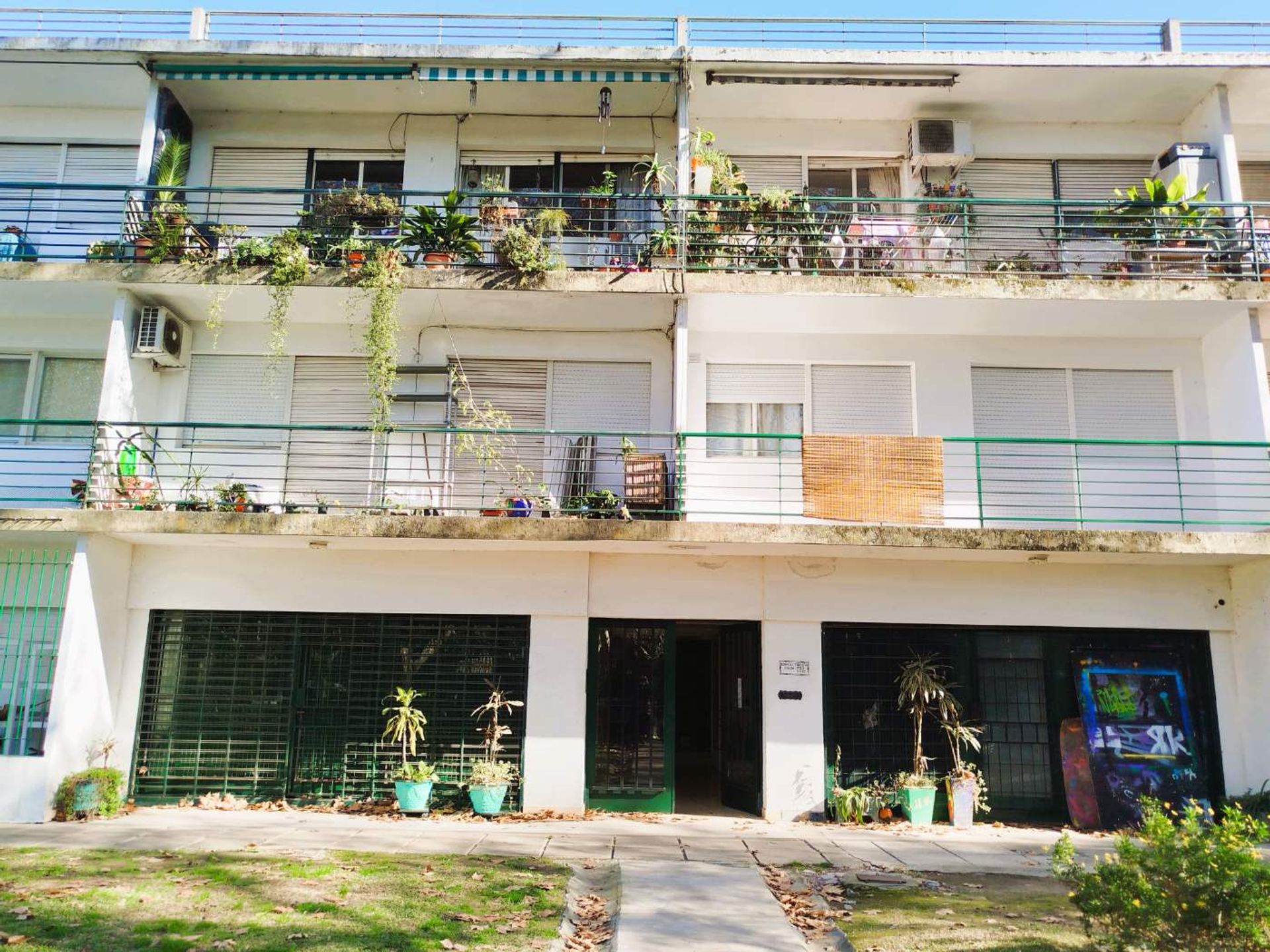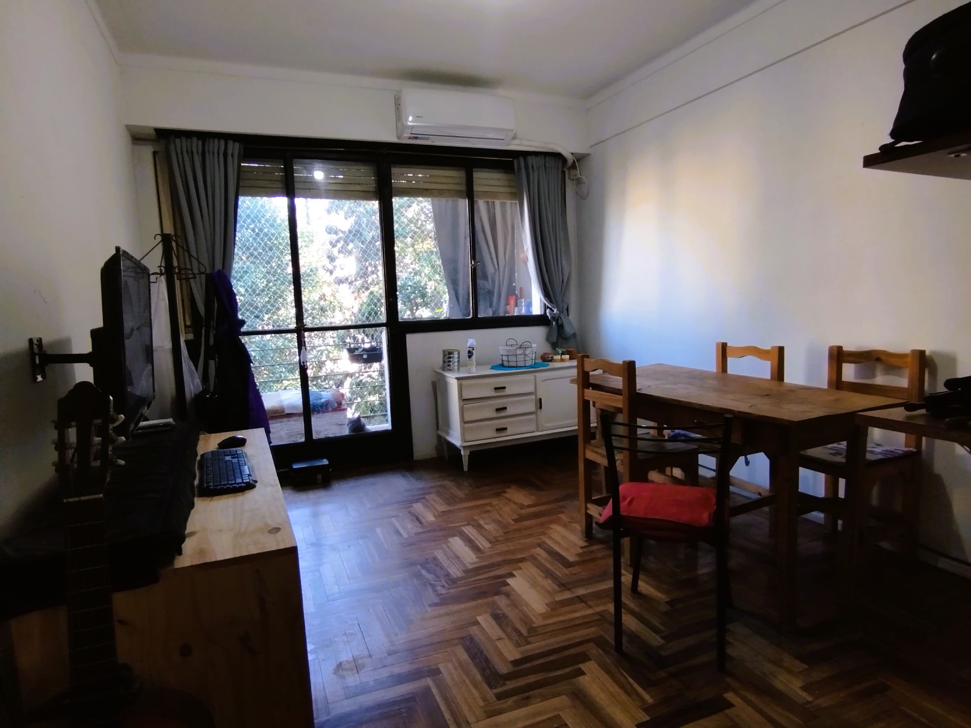 El apartamento dispone de hall de recepción, cocina luminosa con muebles de alto y bajo mesada y artefactos de cocina, living‑comedor con pisos de madera (parquet), baño completo con bañera, dormitorio con placad y pisos de madera, y balcón tipo corrido de 6 m² accesible desde el dormitorio y el living a través de grandes ventanales, que ofrecen una vista al predio y abundante luz natural.