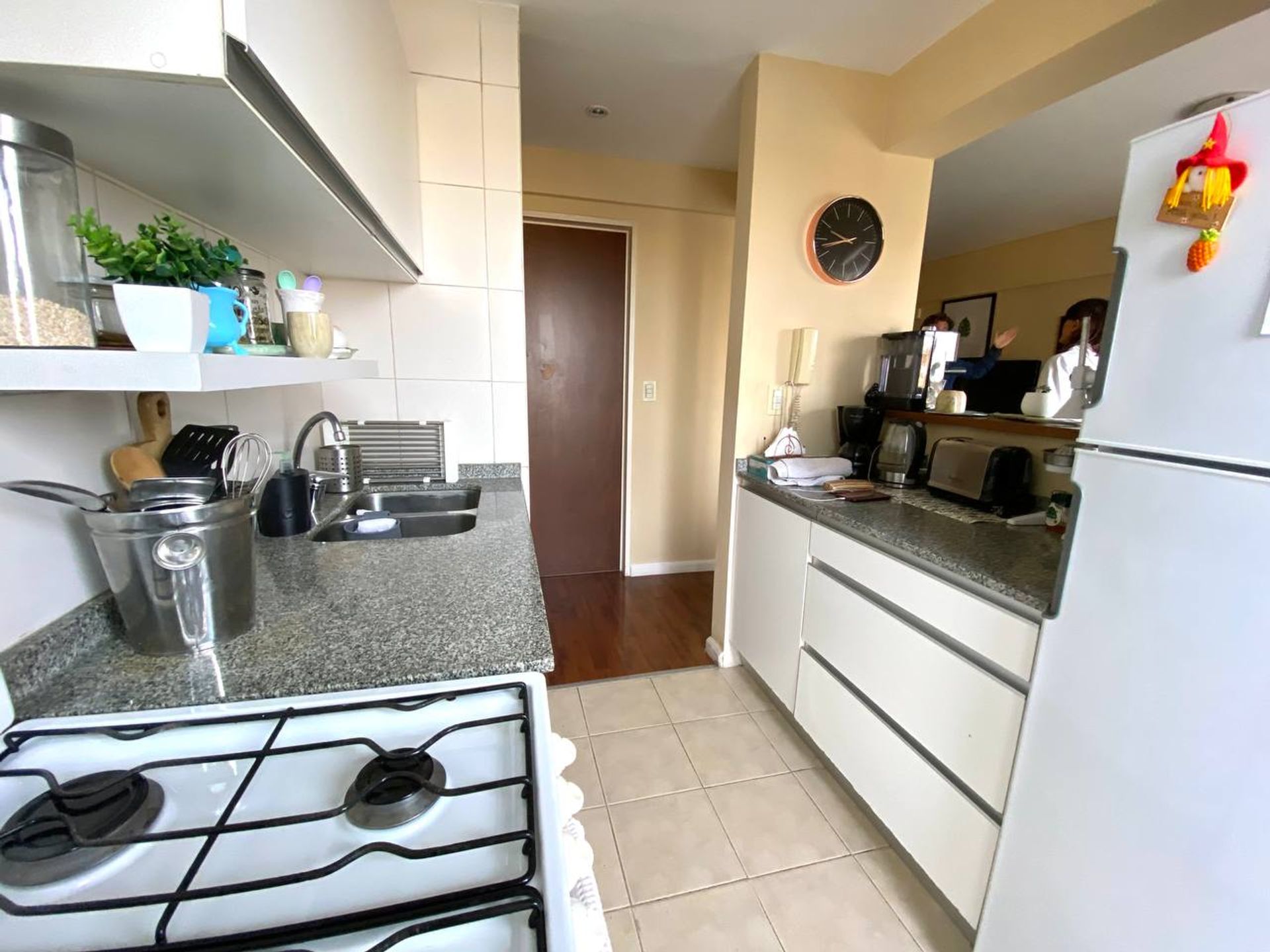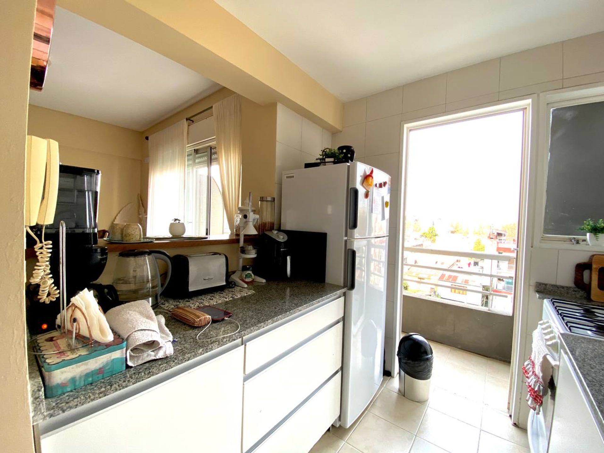 El interior presenta un amplio living comedor integrado con salida al balcón. Desde el pasillo distribuidor se accede a una cocina funcional con alacenas y bajo mesada de melamina, equipada con doble bacha y barra desayunadora que conecta al comedor y al balcón a través de una puerta de vidrio. En el mismo espacio se encuentra un área dedicada a la conexión del lavarropas.