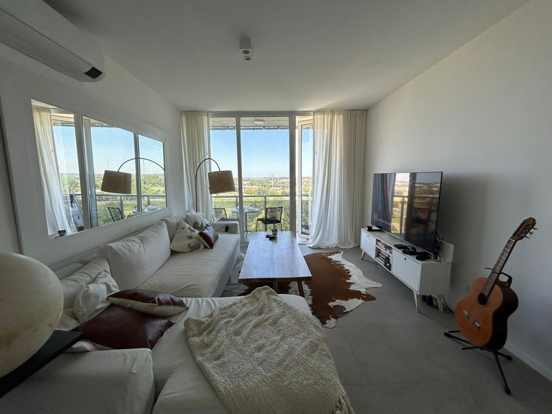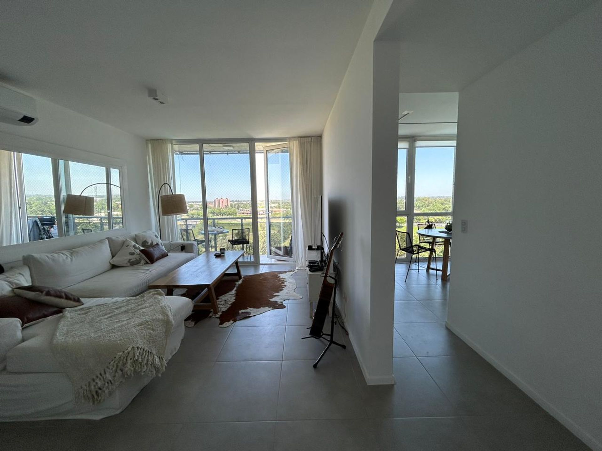Departamento de dos ambientes ubicado en el piso 10 de la torre Nuevo Riverside, con una luz natural abundante y una vista panorámica que enmarca el paisaje urbano de Tigre.