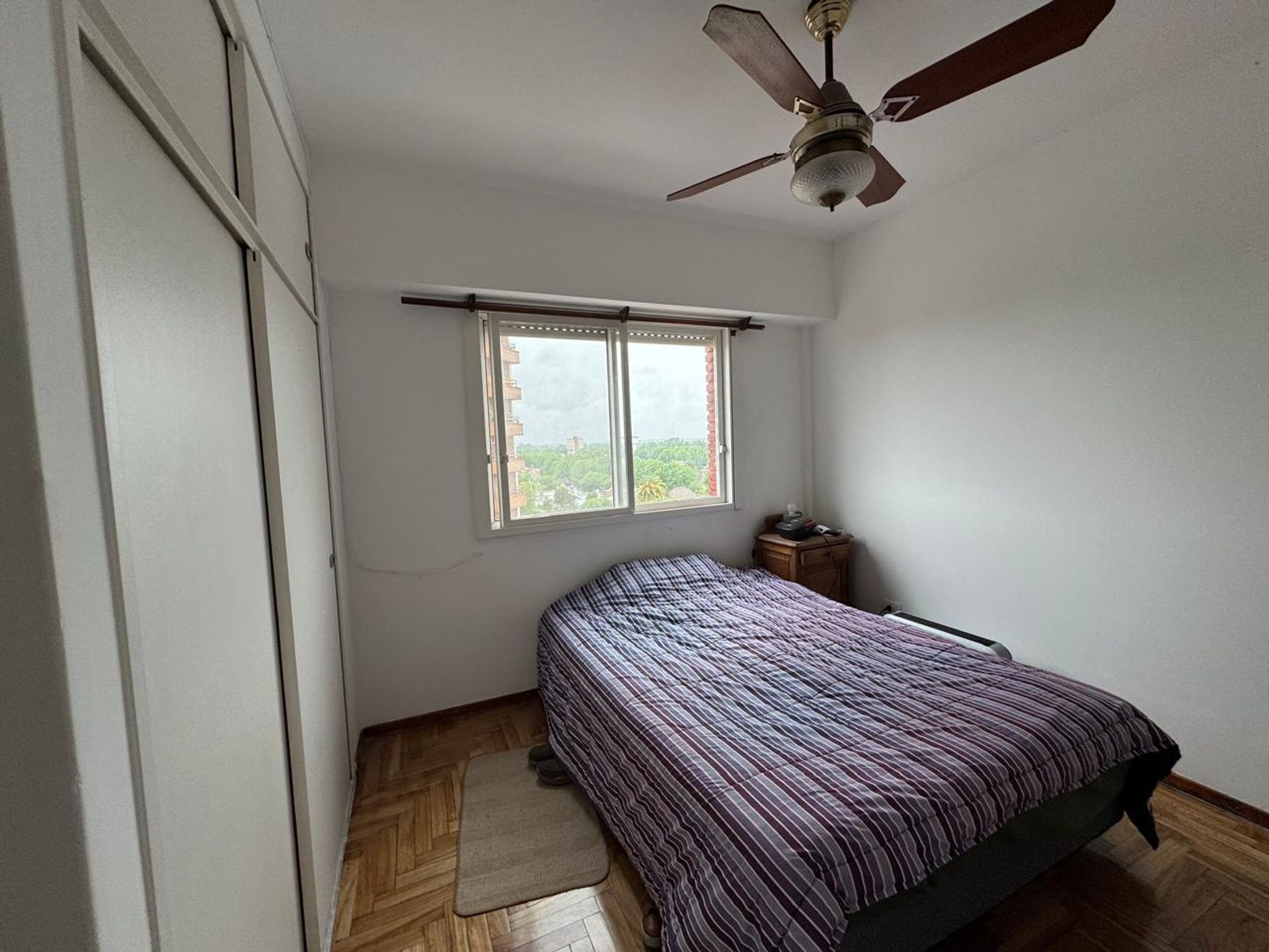 El dormitorio, con dimensiones aproximadas de 3 × 3 m, incluye placard y espacio de almacenamiento adicional. Los pisos de madera se encuentran en perfecto estado, y el ambiente está equipado con aire acondicionado solo en frío.