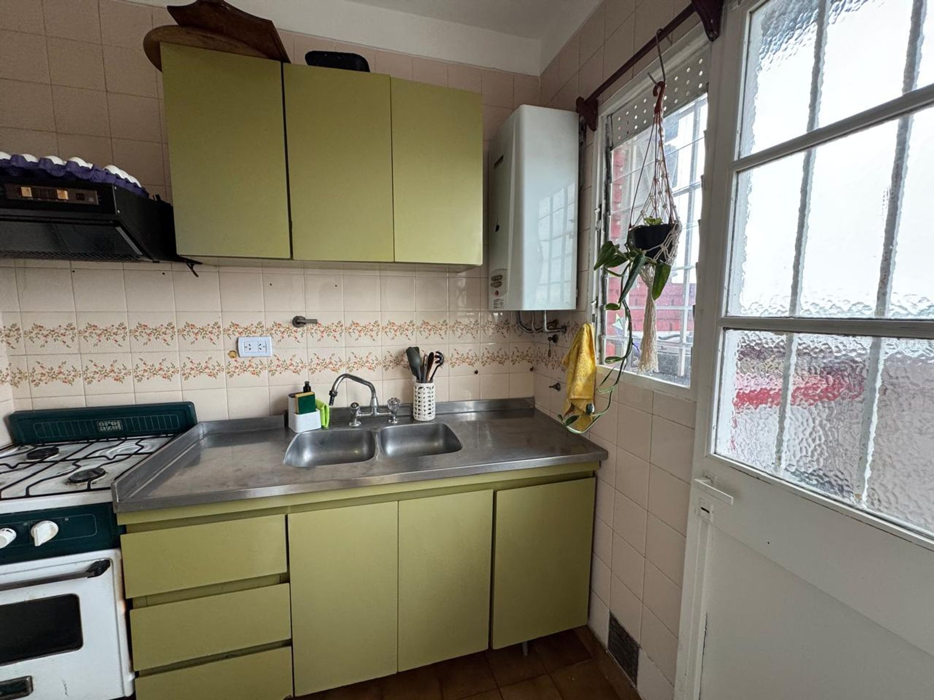 La cocina, en buen estado general, dispone de una generosa alacena y espacio bajo mesada para almacenamiento. Su salida al balcón facilita la ventilación y la iluminación, y está equipada con calefón a gas.