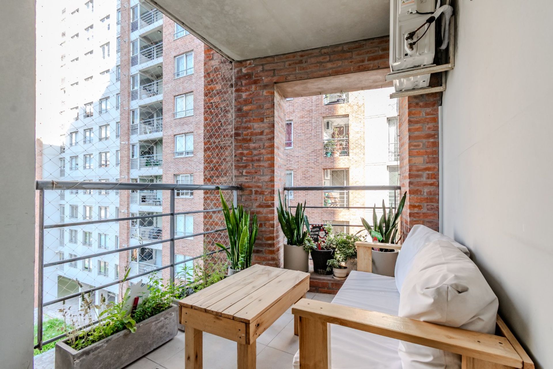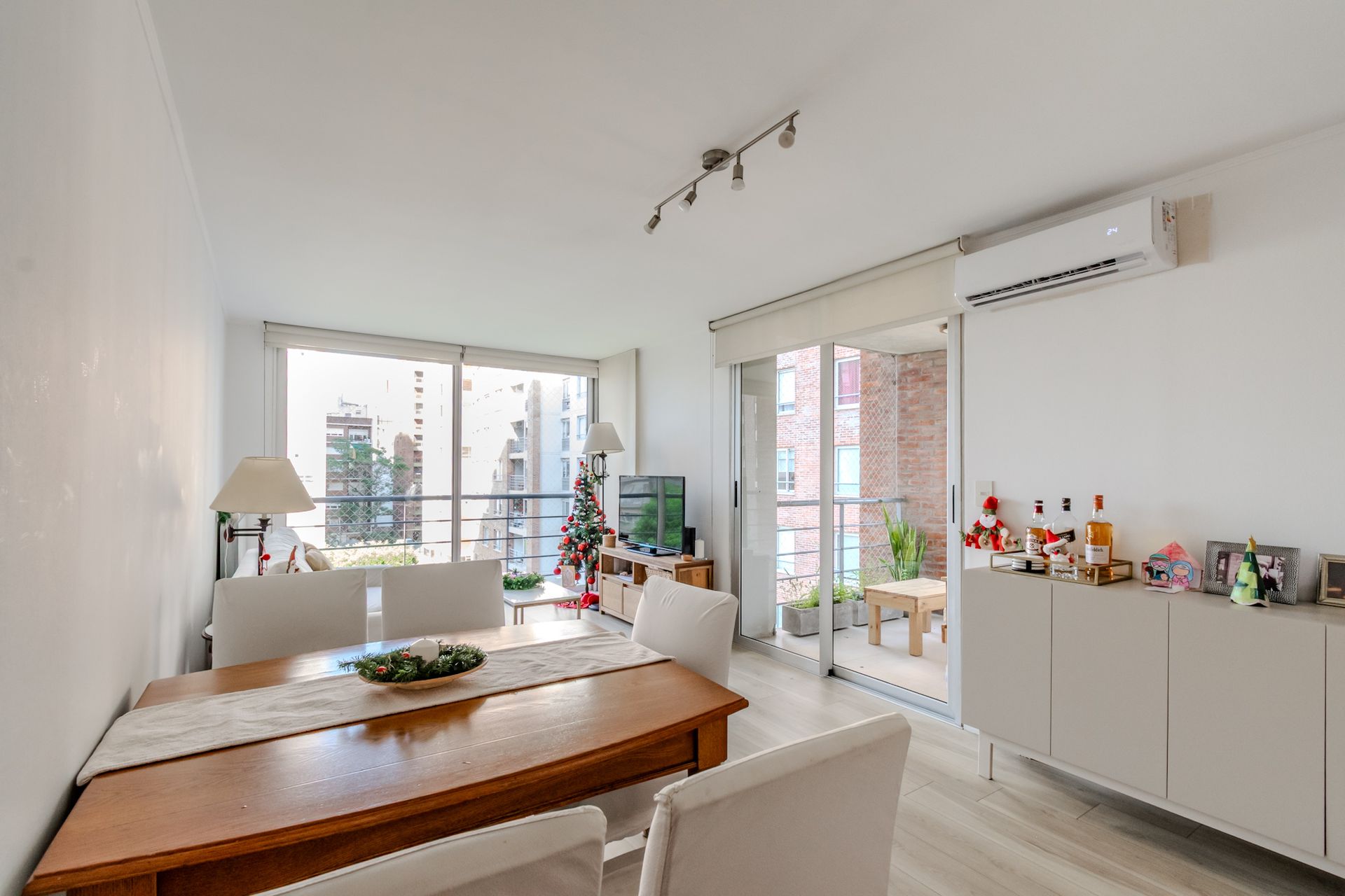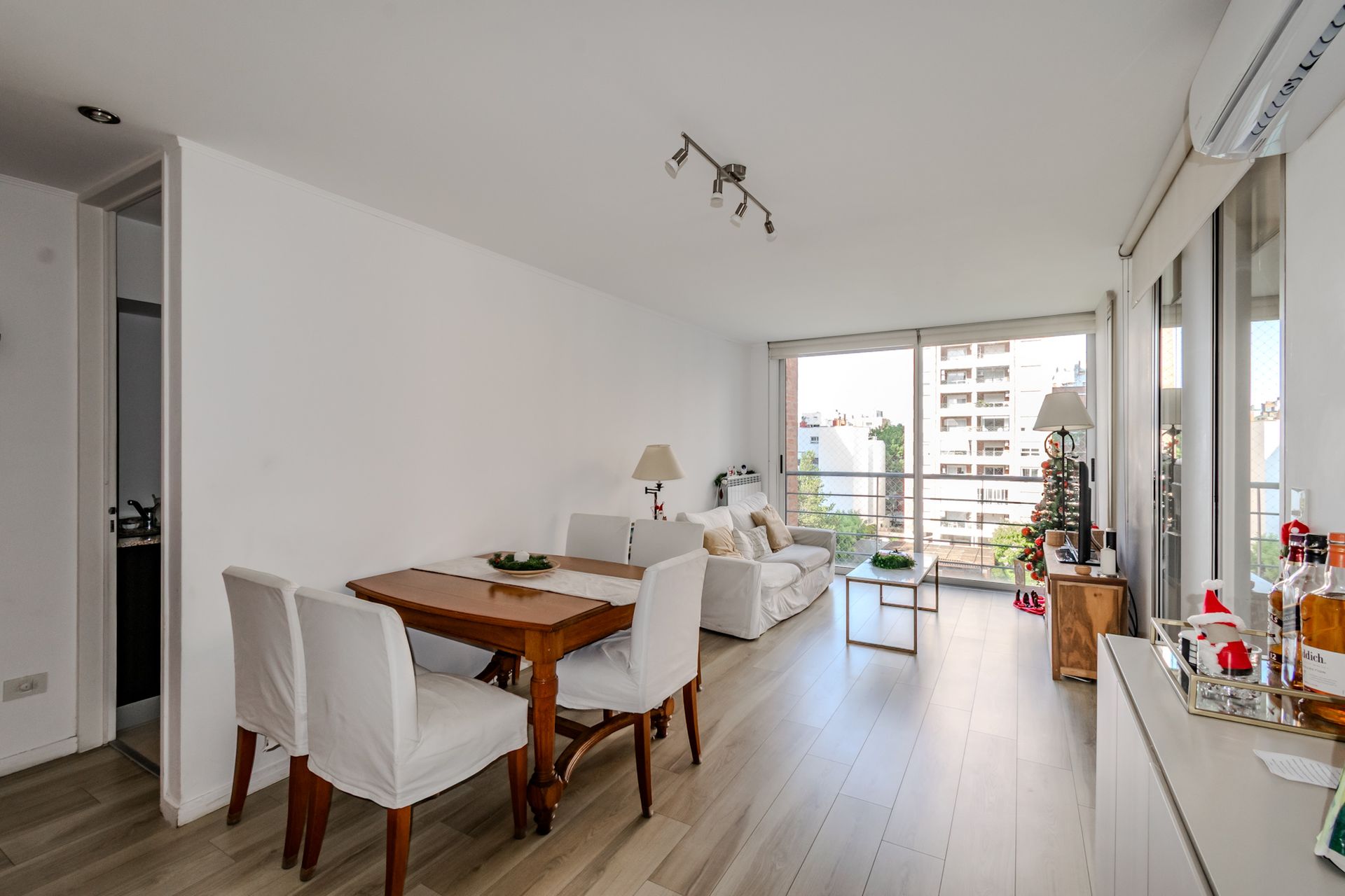 El diseño interior presenta una distribución funcional con tres ambientes. Dos dormitorios, uno de ellos en suite, y un segundo baño completo. El salón-comedor, de 3,30 × 6 m, se abre a ventanales que conectan con el balcón, creando un espacio luminoso y acogedor. La cocina, de 1,70 × 6 m, está equipada con bachas dobles de acero inoxidable, horno y anafe con campana, y cuenta con mesas de granito y piso cerámico.