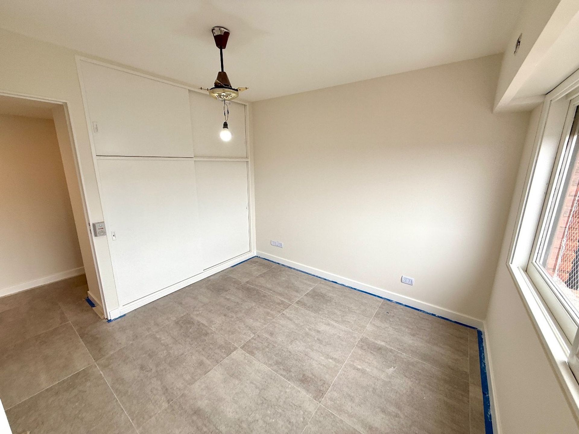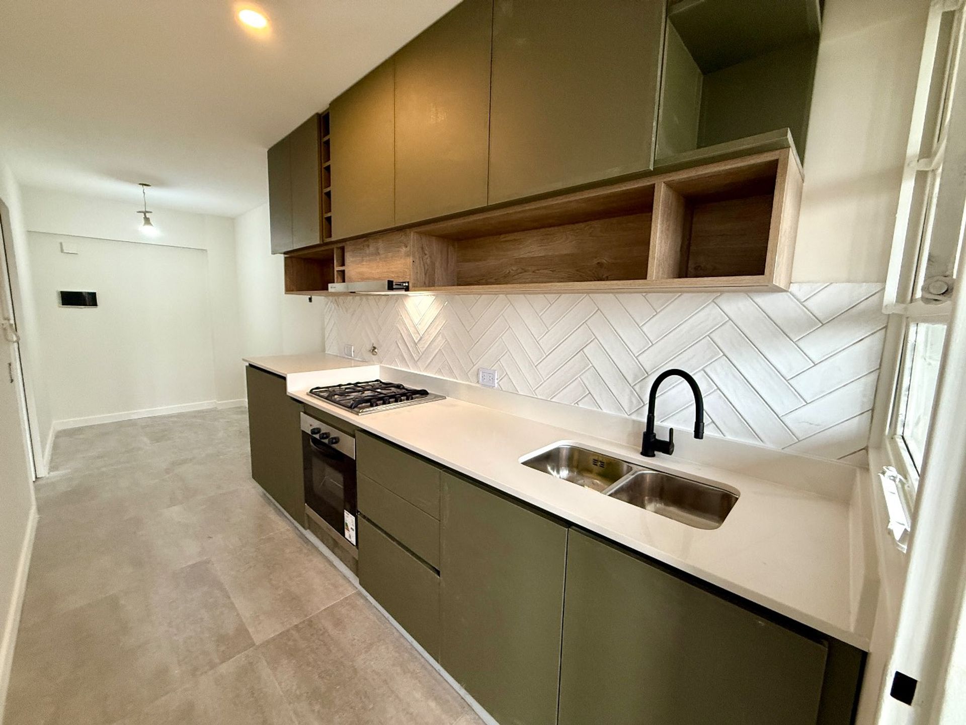 Tres ambientes bien distribuidos incluyen una amplia sala y comedor que se abre al balcón. El aire acondicionado está instalado en todos los ambientes. La cocina cuenta con un espacio para comedor diario, caños de agua, gas y electricidad totalmente reciclados, muebles bajo y sobre la mesada, encimera de Silestone, anafe y horno a gas empotrado. El lavadero independiente dispone de salida al balcón.