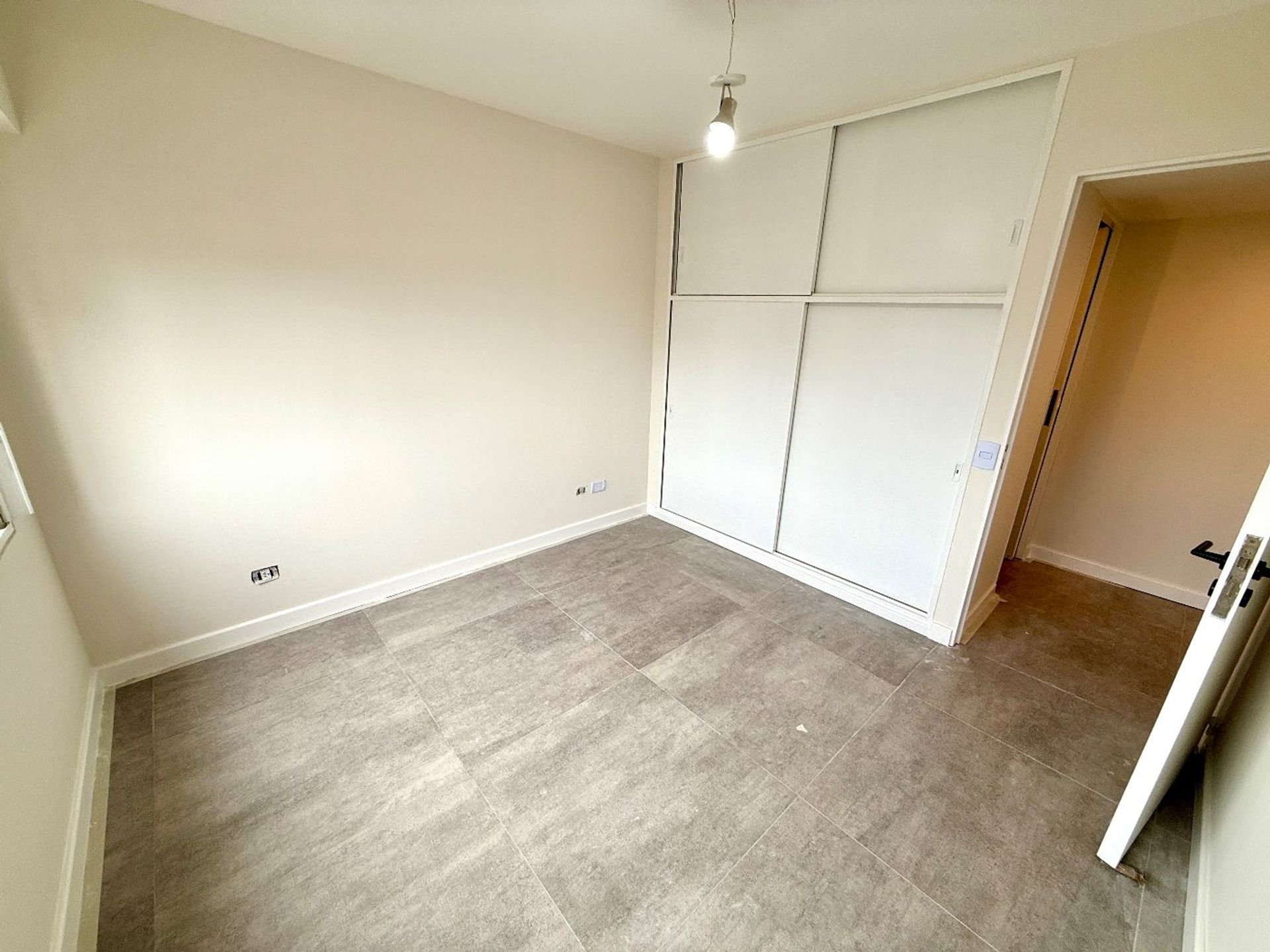 Dos dormitorios cuentan con placares empotrados de piso a techo. El baño completo incluye ducha, mampara, extractor y espejo. Los suelos de porcelanatto de 0,80 × 0,80 m² recubren todo el departamento, y la conexión eléctrica para AA/CC está presente en cada ambiente.