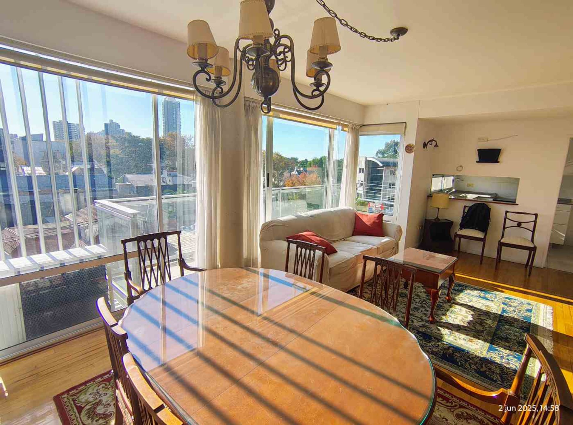 El diseño cuenta con tres amplios ambientes, dos baños completos y un toilette independiente. El living y comedor se abren a una pared de ventanas que inundan el espacio de luz natural, creando una atmósfera acogedora y luminosa.