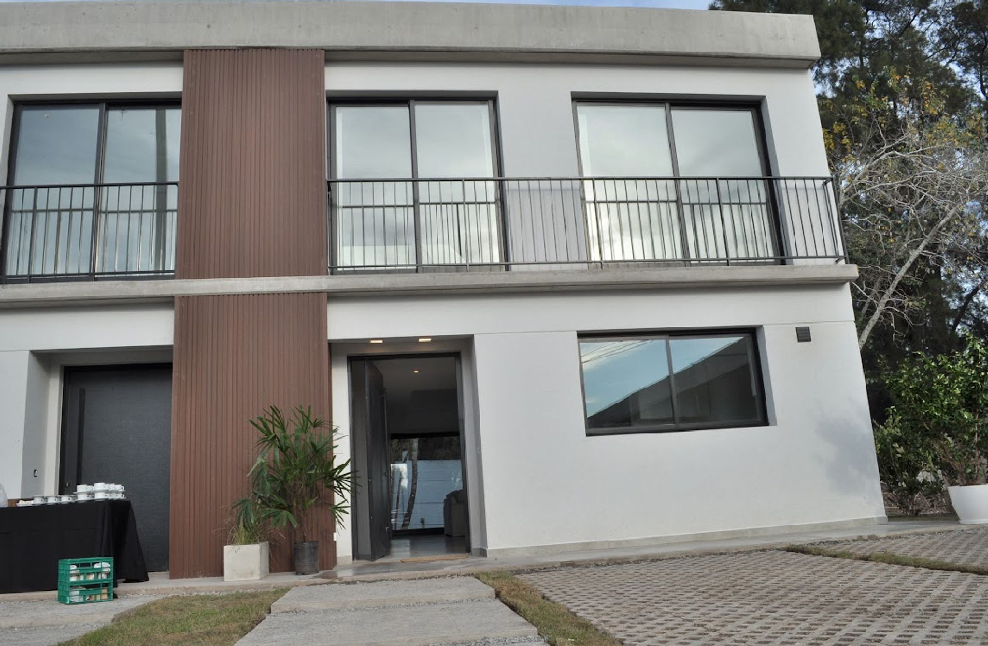 El edificio presenta una fachada revestida en tejuela de ladrillo visto, con un hall de entrada que combina aberturas de aluminio anodizado negro y pisos en porcelanato. Los caminos peatonales y la vereda están hechos de hormigón llaneado, mientras que las cocheras se disponen con circulación en piedra partida. Un portón vehicular motorizado completa la seguridad y la comodidad del entorno.