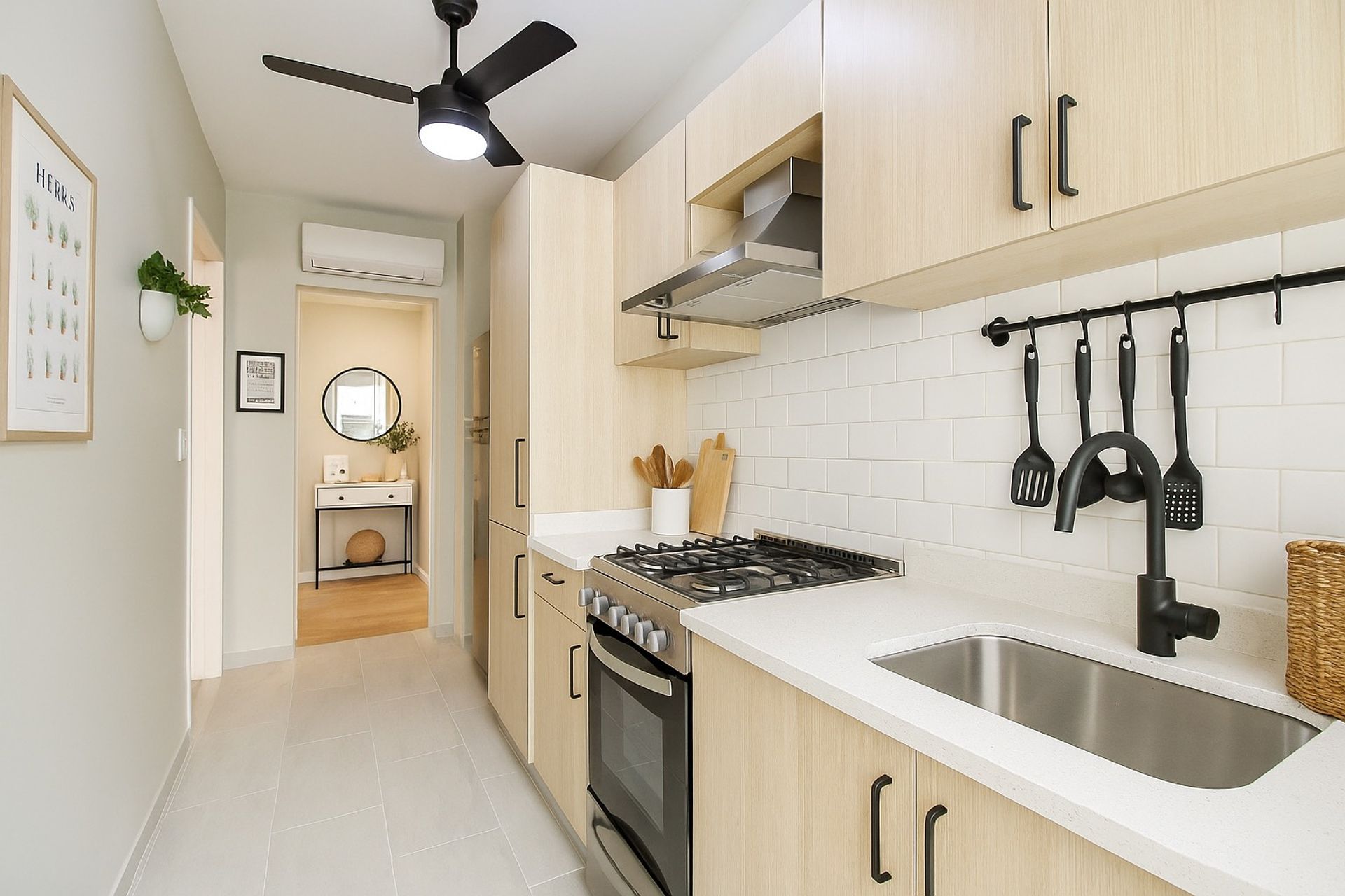 El interior se caracteriza por su luminosidad, gracias a la orientación norte de todos los ambientes y a los ventanales de aluminio DVH. El living-comedor cuenta con excelente iluminación natural y un ventanal que conecta con el balcón. La cocina, amoblada, dispone de espacio para un comedor diario y una heladera. Un lavadero independiente facilita la organización. Dos dormitorios incluyen secciones de guardado empotrado y un hall de distribución conduce al baño completo.