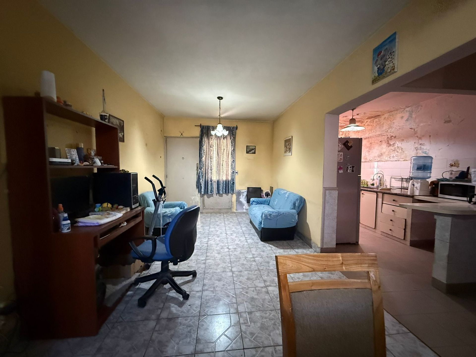 La cocina, separada del salón, es de gran tamaño y cuenta con ventilación adecuada. Hay tres habitaciones que reciben buena luz natural, un baño completo y un lavadero.