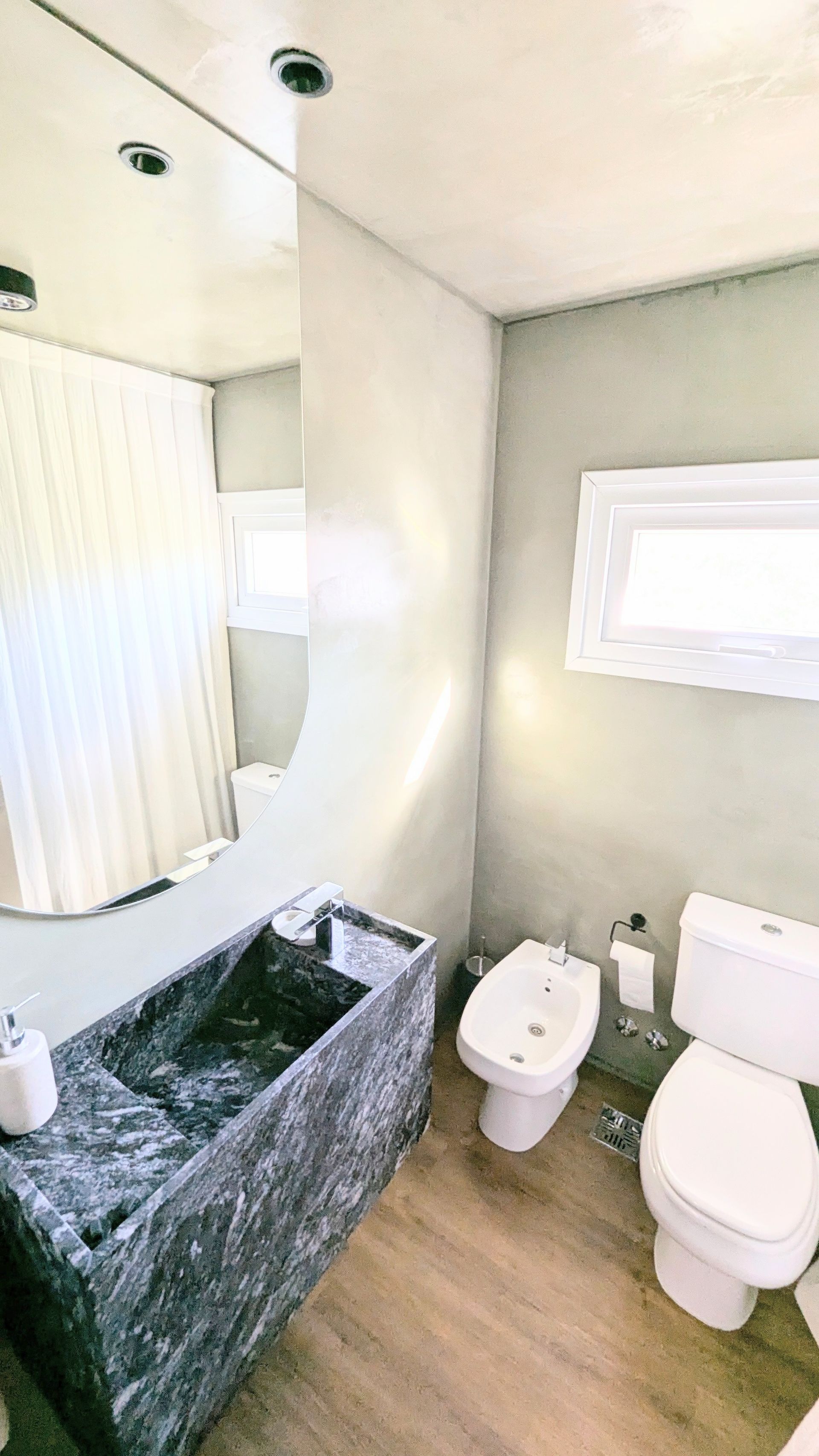 El dormitorio en suite, con baño completo y vestidor, brinda confort y privacidad. El baño cuenta con ducha walk-in, mesada de piedra natural y grifería de diseño. El toilette de recepción está ventilado, con luz natural y una bacha de piedra natural, ofreciendo comodidad para toda la familia o invitados.