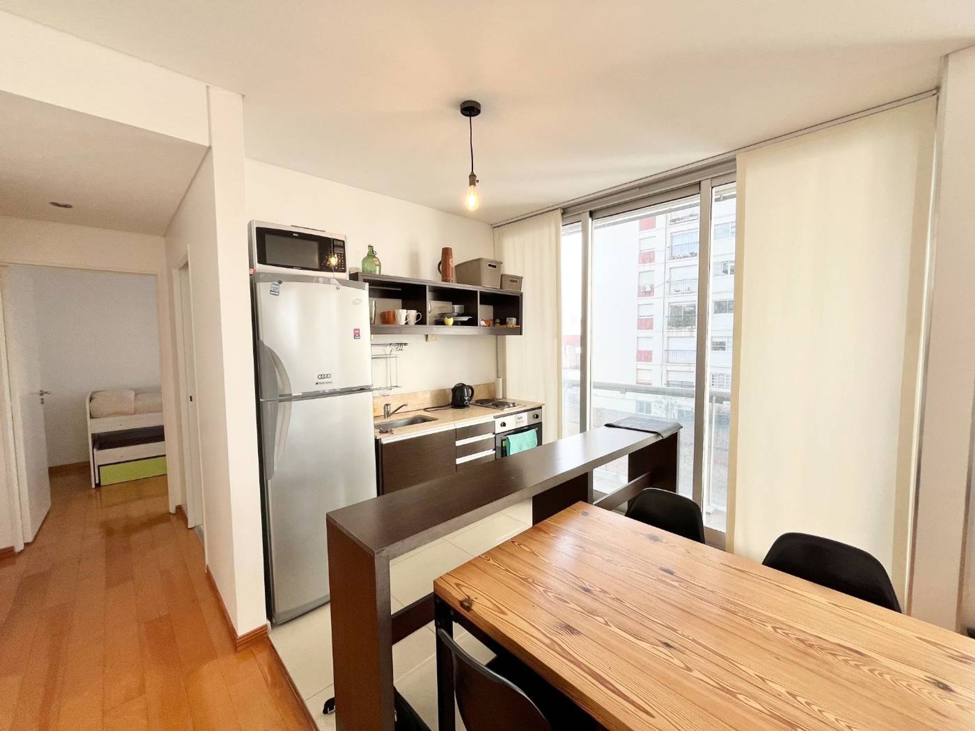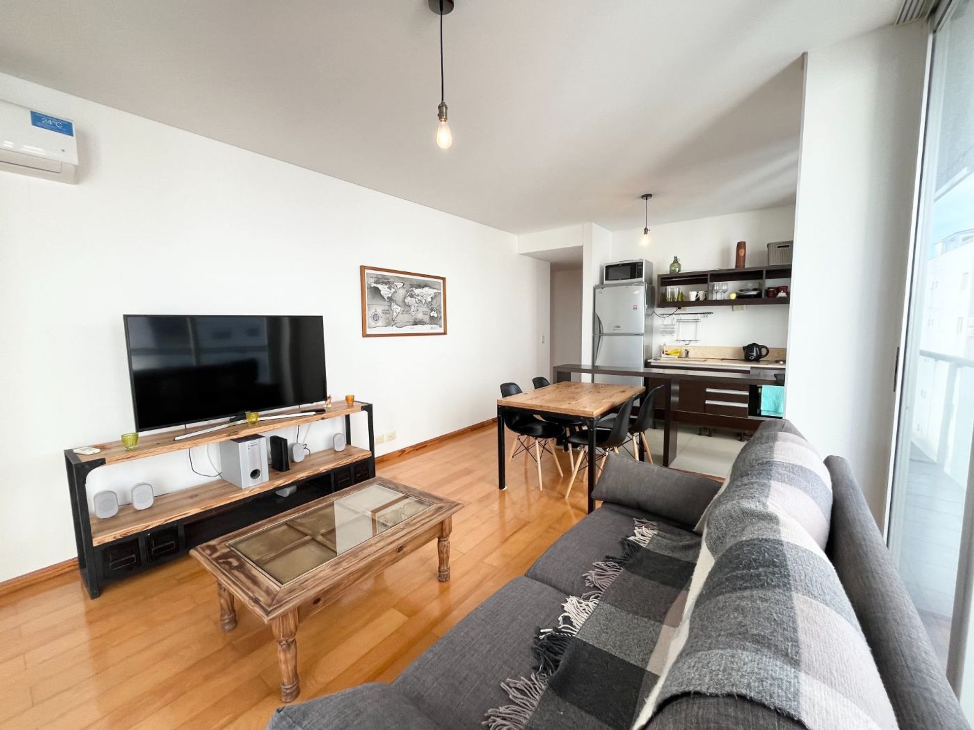 El interior combina elegancia y funcionalidad. Cuenta con dos dormitorios, uno de ellos en suite, y un segundo baño completo. La cocina, moderna y totalmente equipada, incluye anafe y horno eléctrico, y una barra desayunadora que integra el espacio con el amplio living comedor. Desde el gran ventanal se accede a un balcón en esquina que ofrece vistas incomparables. El dormitorio principal dispone de amplio placard de piso a techo y baño propio, además de un ventanal que abre al balcón esquinero. La luminosidad natural es destacable en todo el inmueble.
