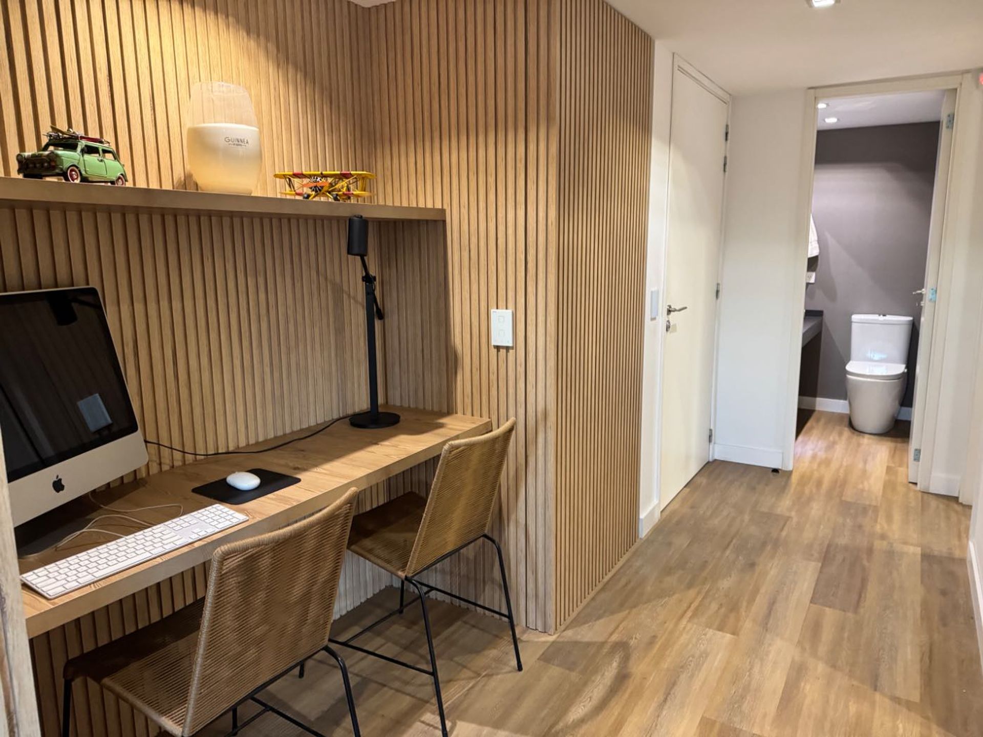 El amplio living comedor se abre a un balcón corrido de 14 m², ofreciendo vistas abiertas y la posibilidad de disfrutar del aire libre desde la comodidad del hogar. La cocina, elegante y bien equipada, se integra armoniosamente con el área social. Dos dormitorios en suite garantizan privacidad y confort, mientras que el den sirve como espacio flexible, ideal para home office o zona de lectura.