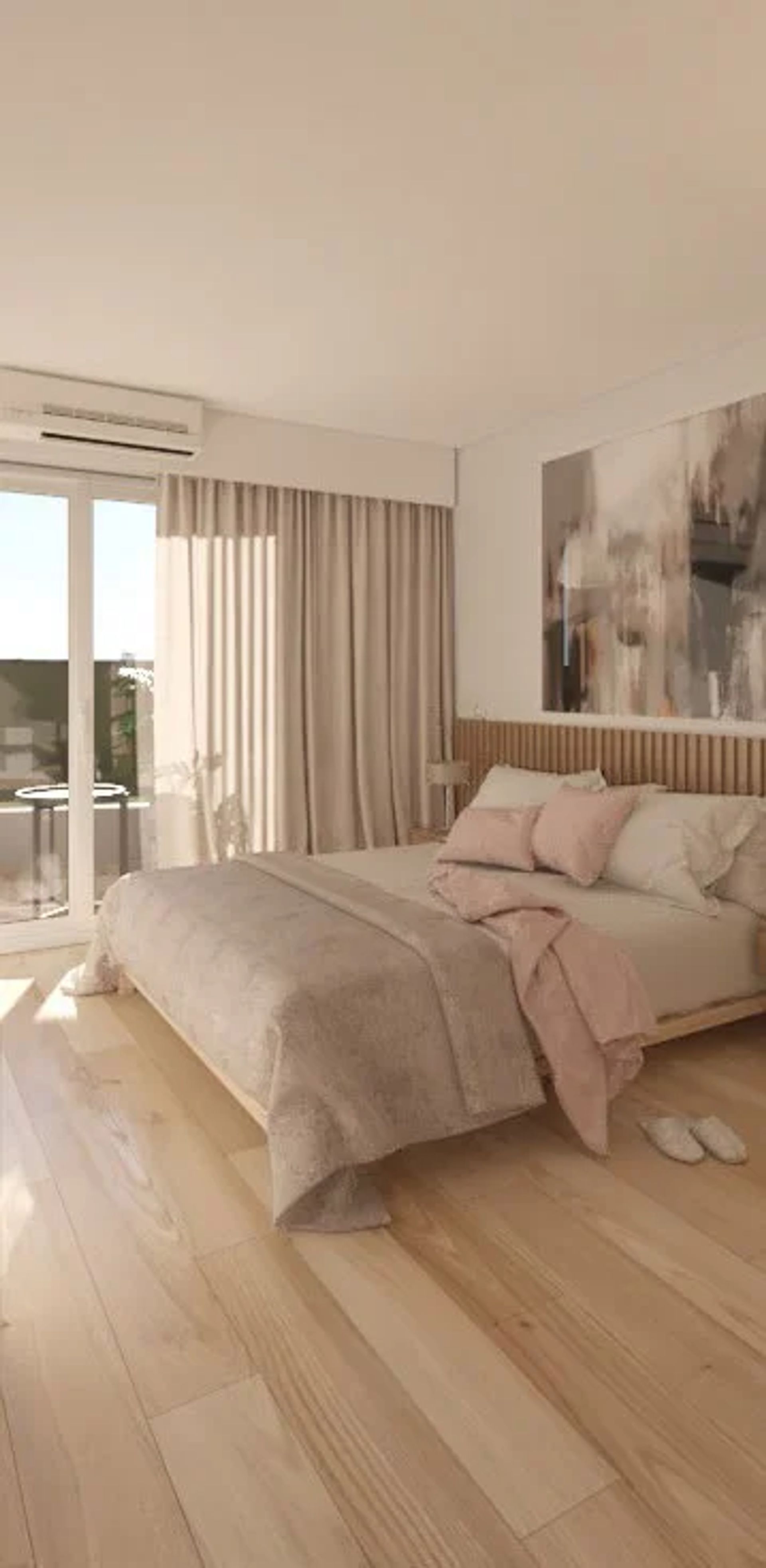 Para adaptarse a las condiciones ambientales de la zona, el proyecto incorpora losa radiante y un sistema individual de aire frío/calor, asegurando confort y eficiencia energética en cada vivienda.