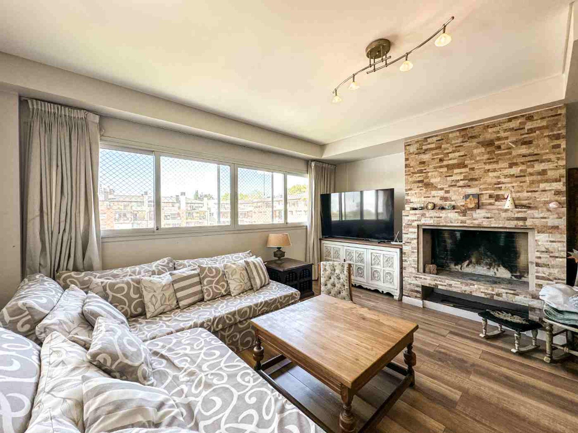 En la planta baja se abre un amplio living comedor, iluminado por grandes ventanales y adornado con una imponente chimenea central revestida en piedra. El espacio se extiende hacia una terraza principal, accesible tanto desde el salón como desde la cocina. Esta última, amplia y funcional, cuenta con abundante almacenamiento, un lavadero con bacha propia y espacio dedicado para lavadora. Bajo la escalera se encuentra una baulera de buen tamaño y un toilette de diseño contemporáneo.