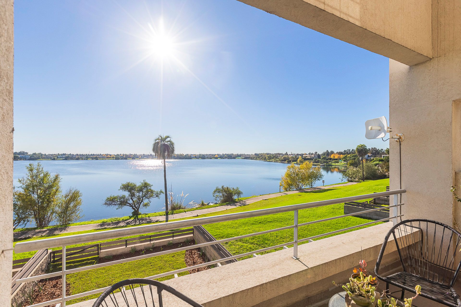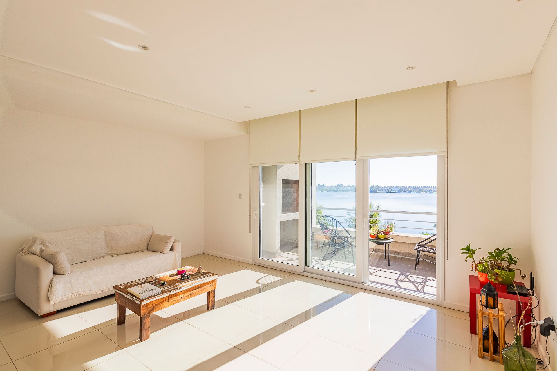 El living‑comedor ofrece impresionantes vistas al lago; la cocina integrada puede cerrarse. Un dormitorio en suite amplio con vestidor y terraza propia, y un segundo dormitorio con baño completo o tocador, con placard de piso a techo corredizo en melamina blanca.