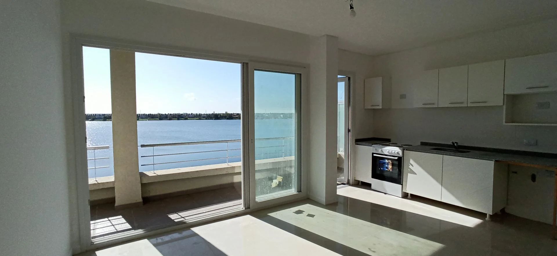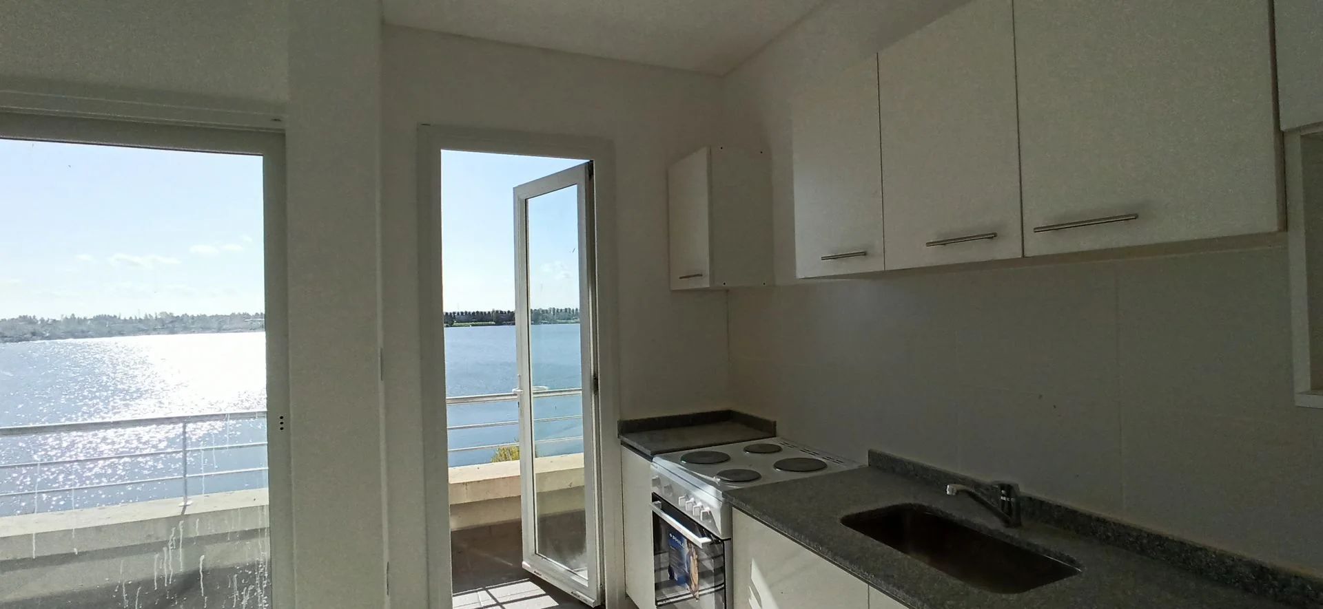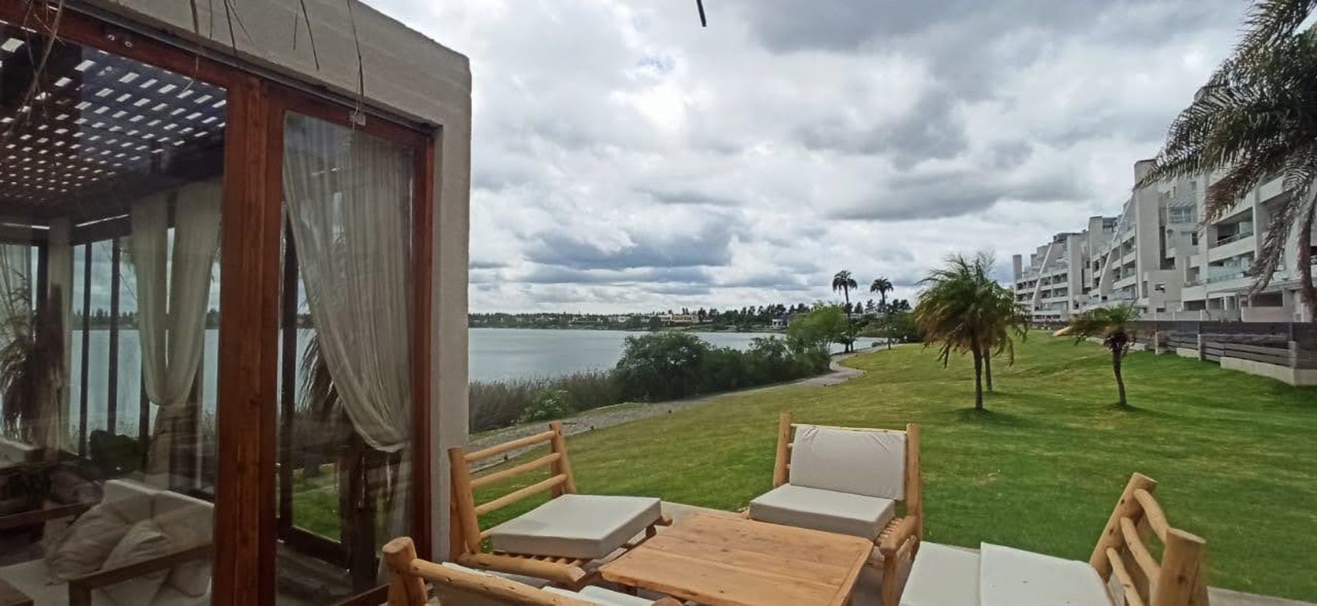 La vivienda dispone de dos habitaciones, una de ellas en suite con vestidor y terraza propia, ideal para quienes buscan comodidad y privacidad. El salón y la cocina también abren al lago, ofreciendo vistas panorámicas y una sensación de amplitud. El aire acondicionado central, con funciones de frío y calor, mantiene la temperatura ideal en cualquier época del año. Las aberturas de PVC y los pisos de porcelanato brillante aportan un toque moderno y de calidad a los ambientes.