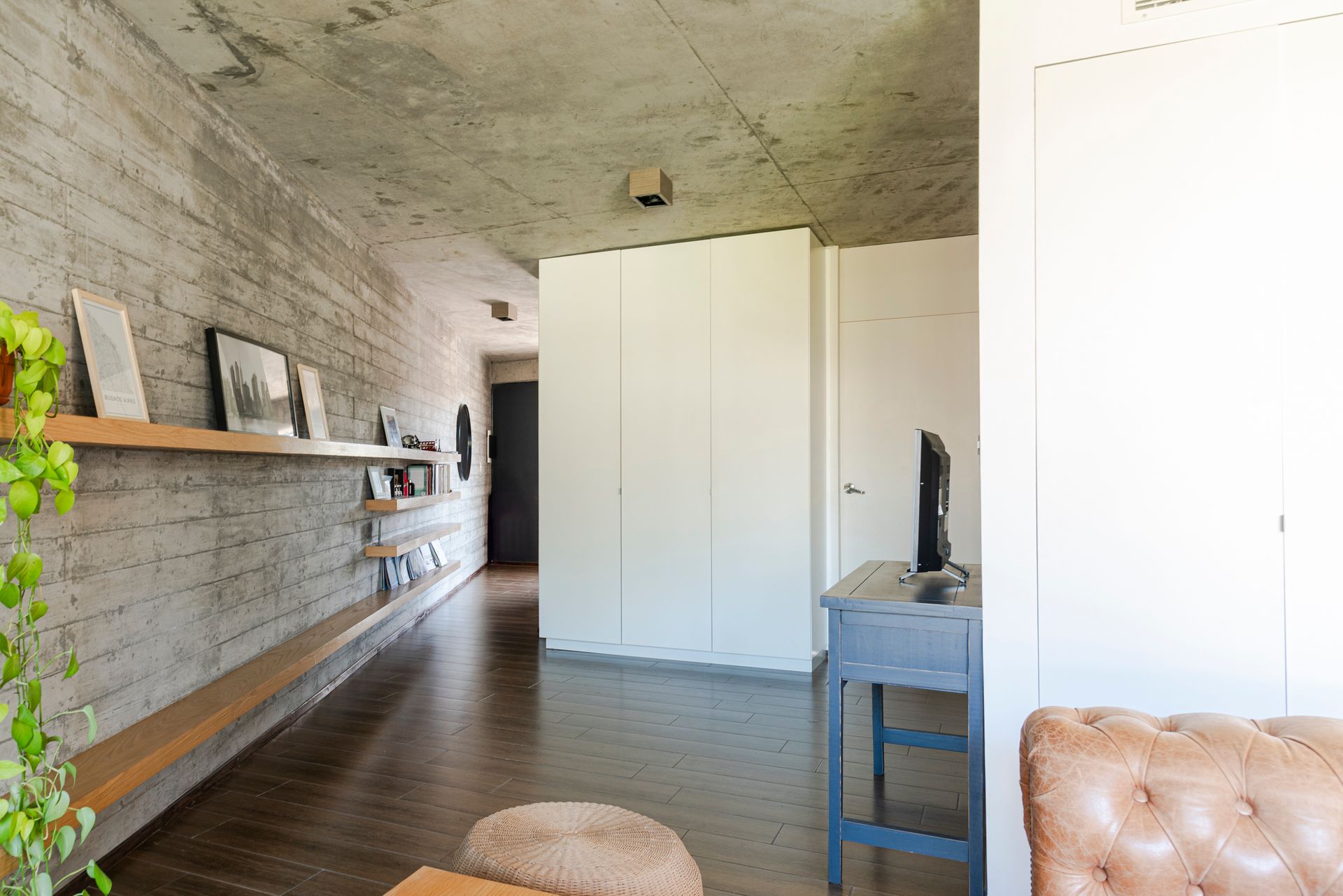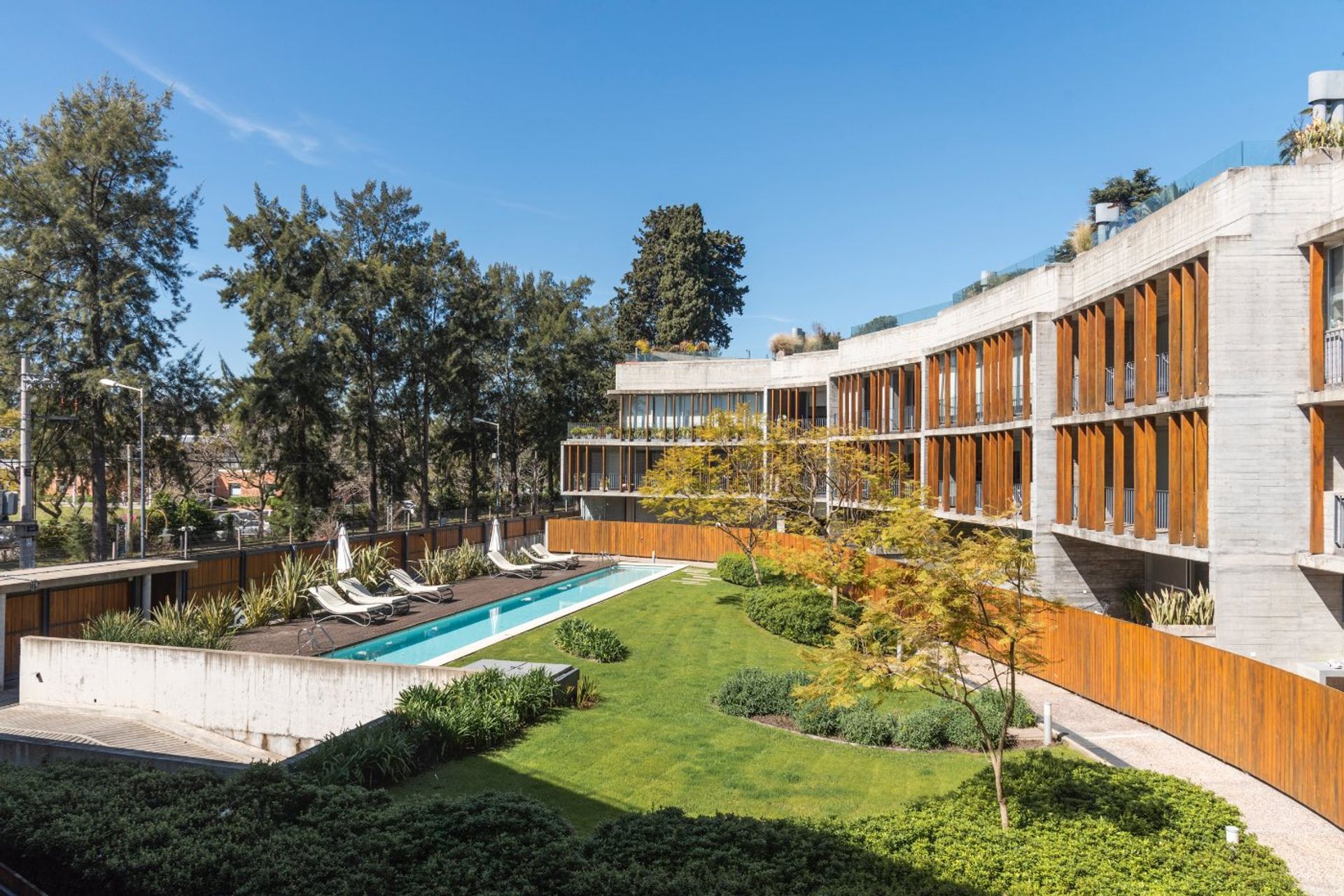El interior presenta una distribución abierta con un living integrado a la cocina, equipada con barra y electrodomésticos eléctricos, y con acceso directo a un balcón orientado al este, equipado con parrilla, ideal para disfrutar de la mañana. Los dos dormitorios incluyen un dormitorio principal en suite y un segundo dormitorio con espacio dedicado a escritorio, mientras que el recibidor cuenta con placard. Los pisos de porcelanato y la insonorización de alta calidad garantizan un ambiente silencioso y una vista interior excepcional.
