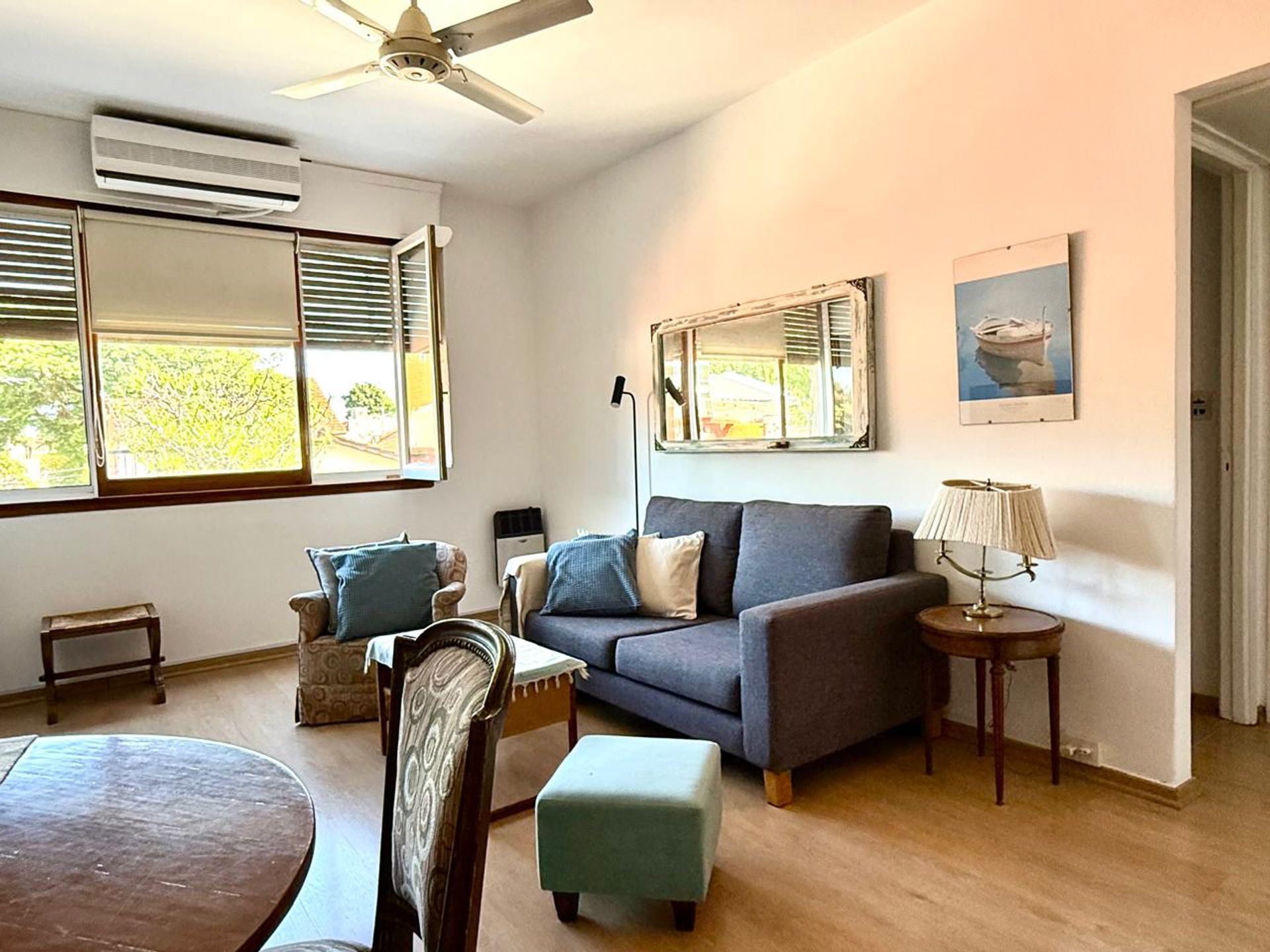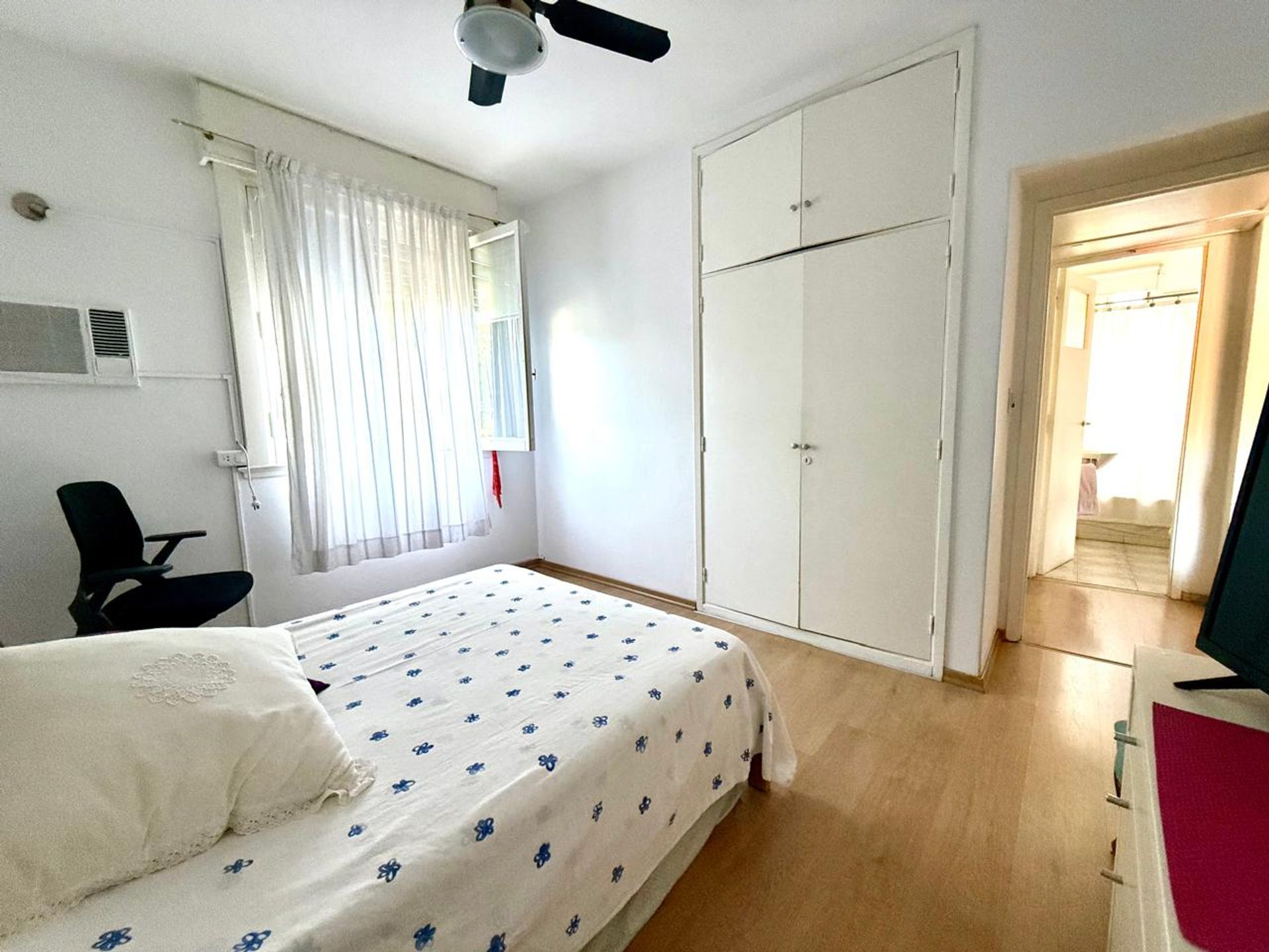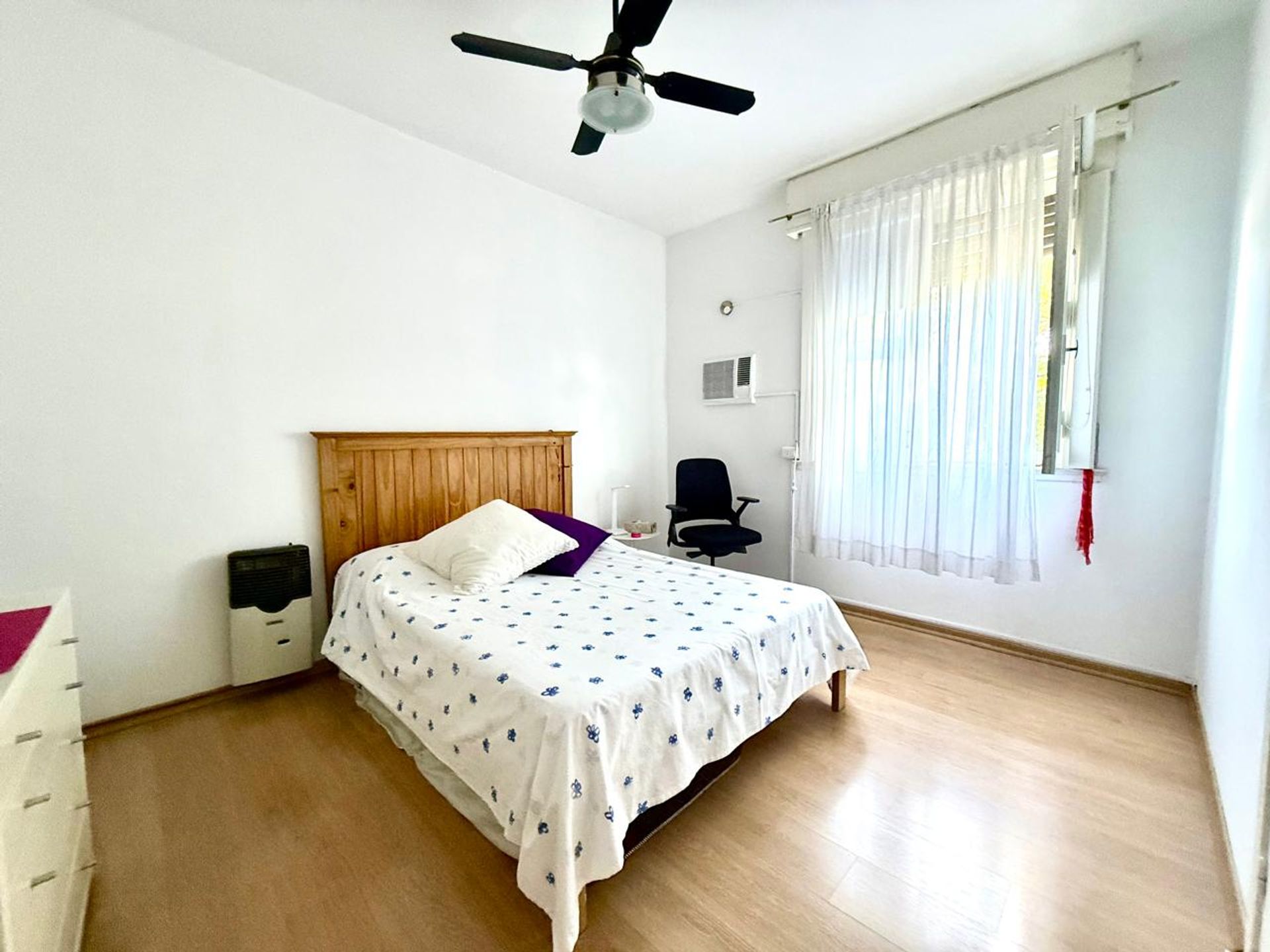 La cocina, equipada con lavadero integrado, dispone de conexión para lavarropas y espacio dedicado para tender. Un pasillo con placard ofrece almacenamiento adicional. El primer dormitorio presenta piso parquet, mientras que el segundo dormitorio mantiene la misma calidad de suelo. El baño, actualizado hace 25 años, cuenta con ducha ventilada y acabados modernos.