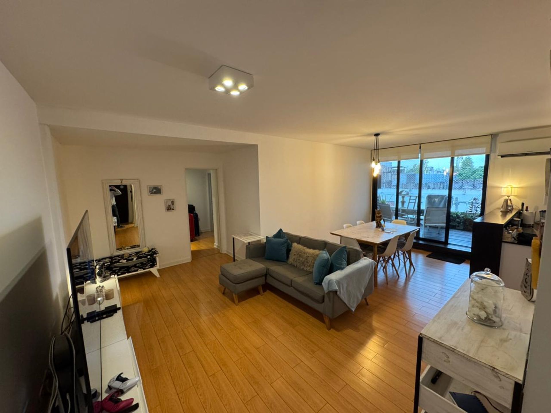 El apartamento dispone de dos dormitorios, uno en suite con vestidor y otro con amplio placard, además de un baño completo que da servicio al segundo dormitorio. La distribución favorece la luminosidad y la ventilación cruzada. La calefacción se realiza mediante losa radiante con termostato individual, y todos los ambientes cuentan con aire acondicionado.