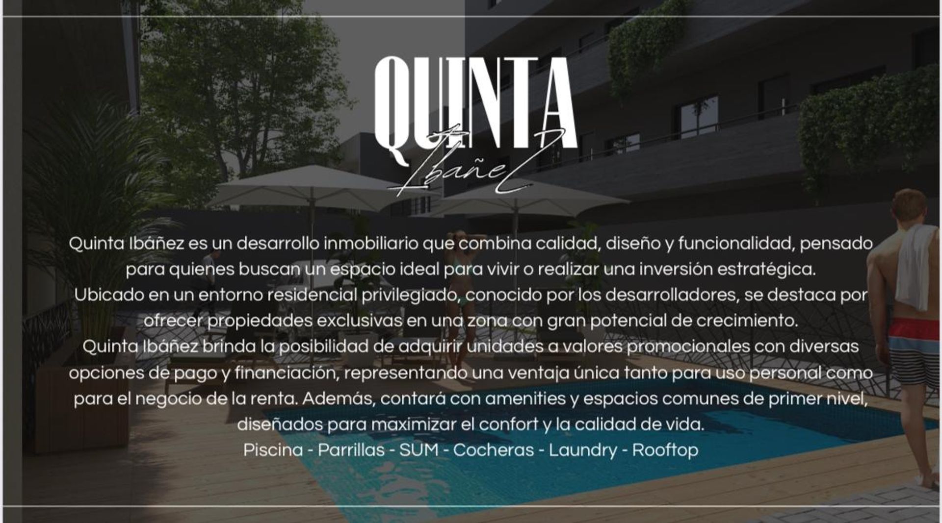 Quinta Ibañez es un complejo residencial de alto standing, concebido para quienes buscan un estilo de vida contemporáneo sin renunciar a la tranquilidad de un entorno natural. Con un extenso terreno de 1650 m², el proyecto destaca por su diseño moderno, la calidad de sus materiales y la seguridad que brinda a sus residentes.