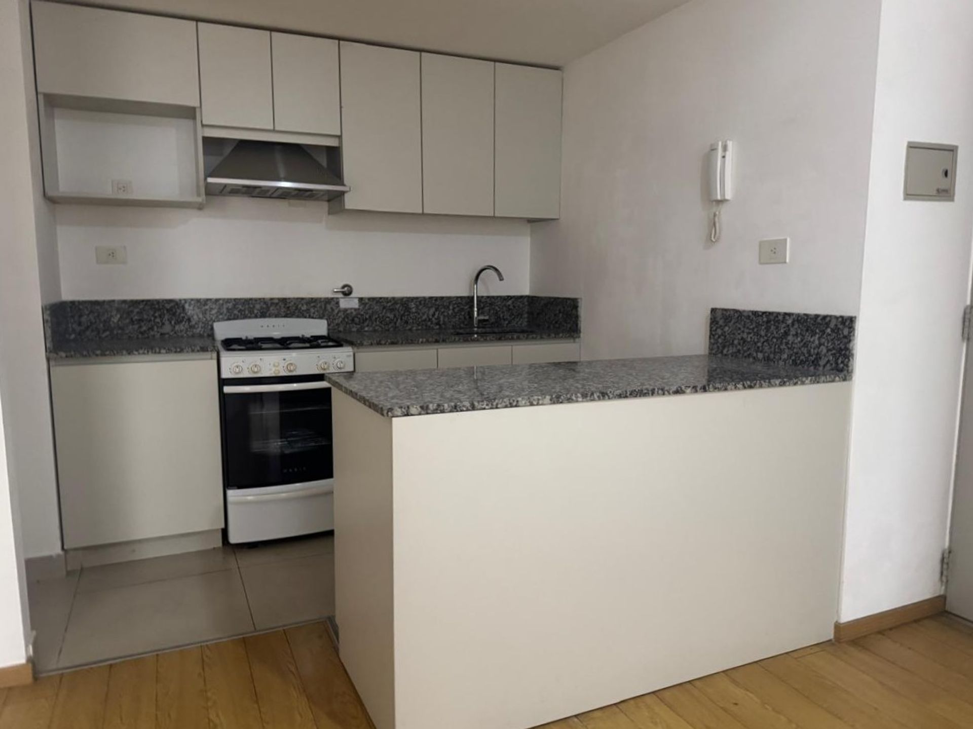 La distribución incluye un dormitorio con vestidor, un baño completo, un amplio living comedor con salida a balcón y una cocina integrada con mesada de granito, muebles bajo y sobre mesada, y cocina a gas.