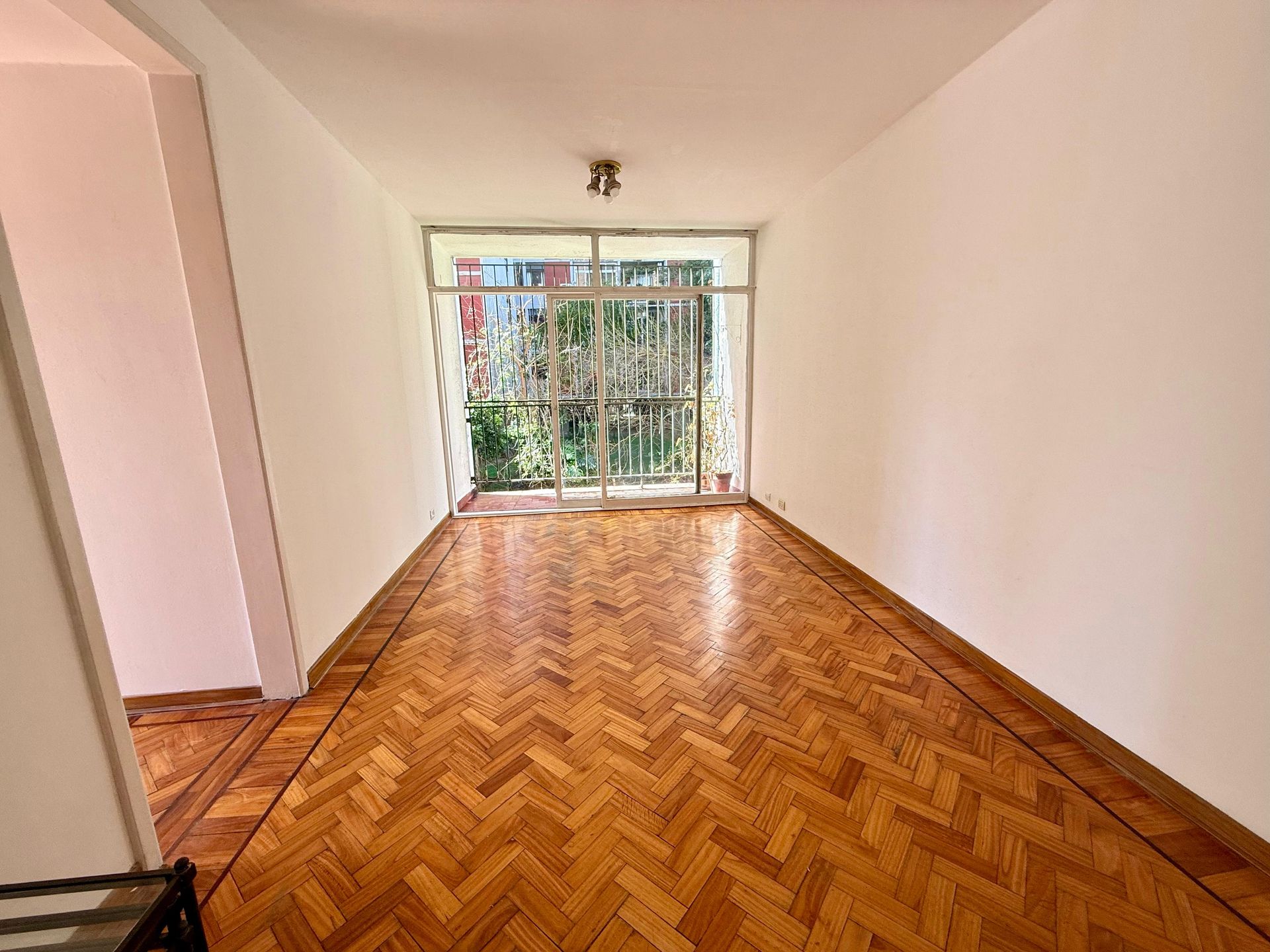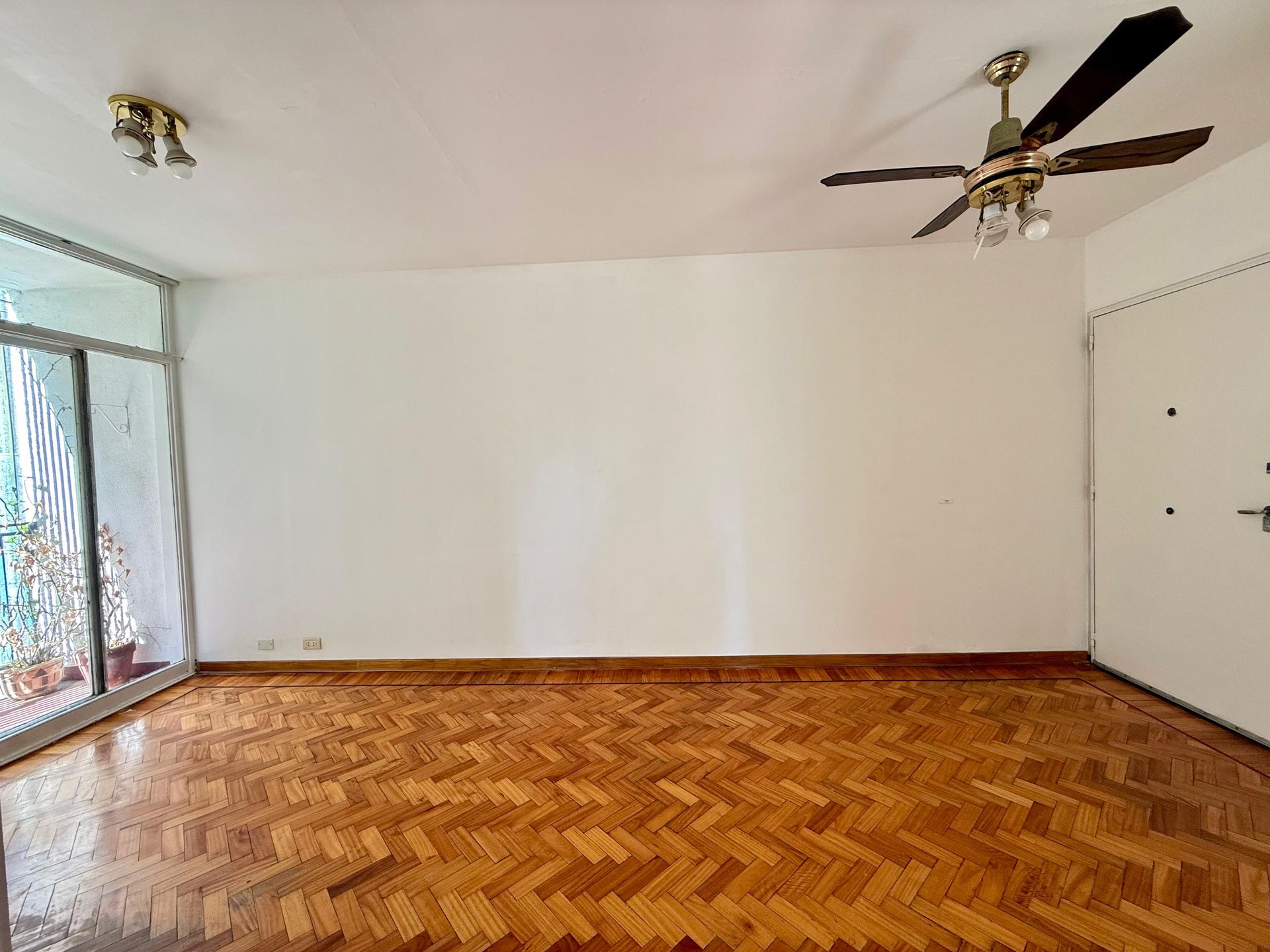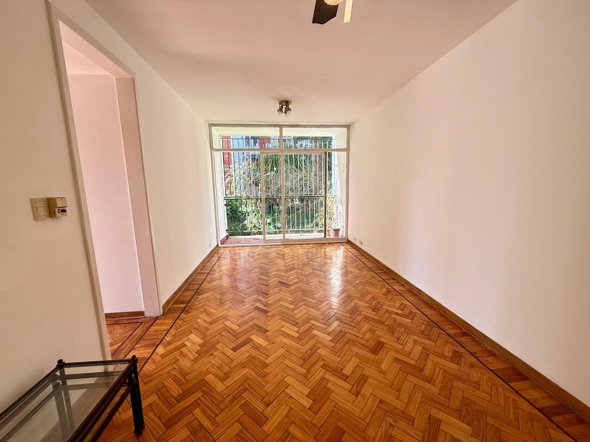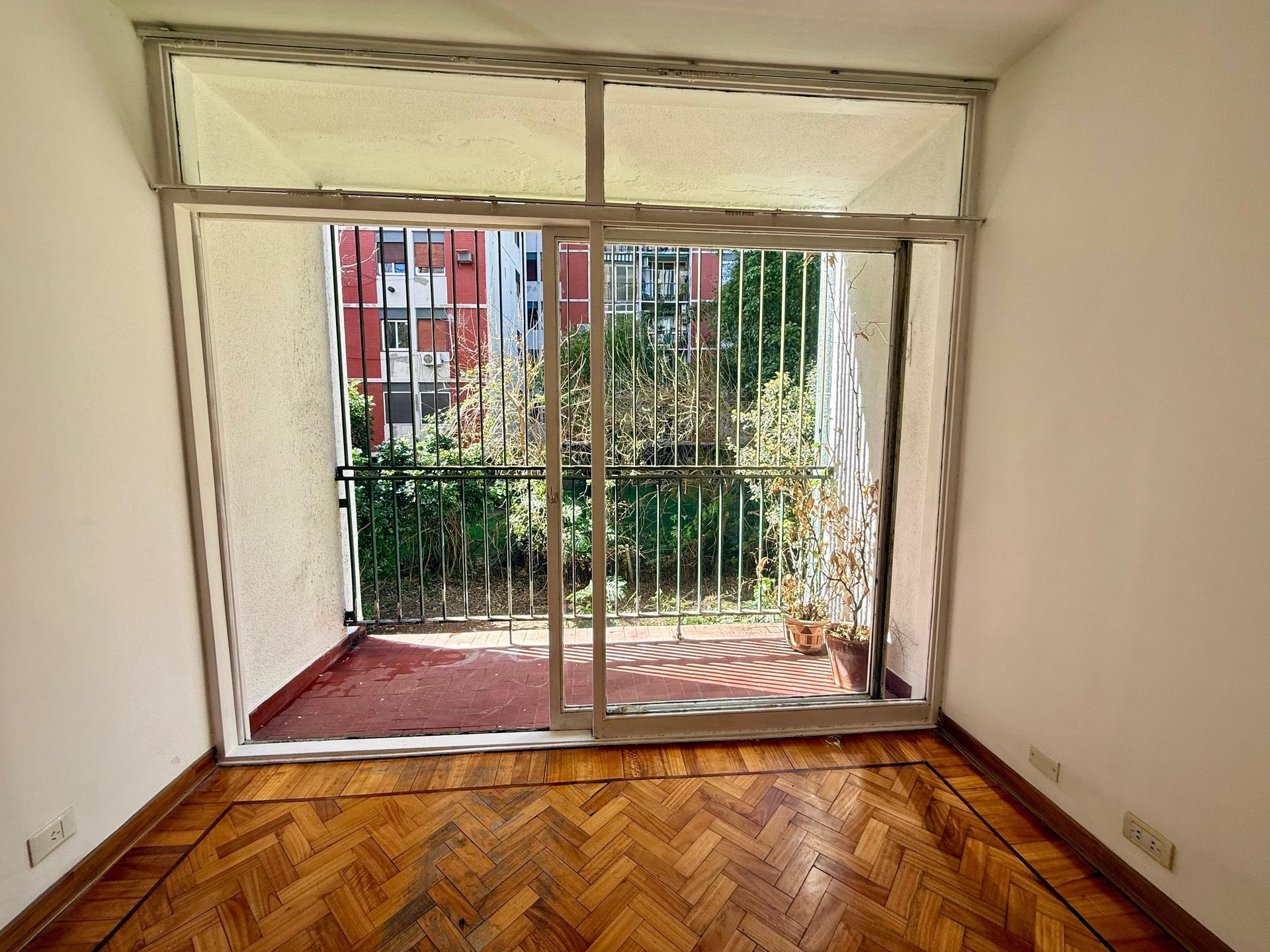 El pasillo conduce al dormitorio con placard y al baño completo, mientras que una terraza privada con vistas a los jardines del edificio invita a relajarse y contemplar el entorno. El edificio, construido en 1970, se mantiene en muy buen estado general, con pisos de parquet, aire acondicionado en el dormitorio, calefacción por losa radiante y agua caliente central, todos incluidos en las expensas.