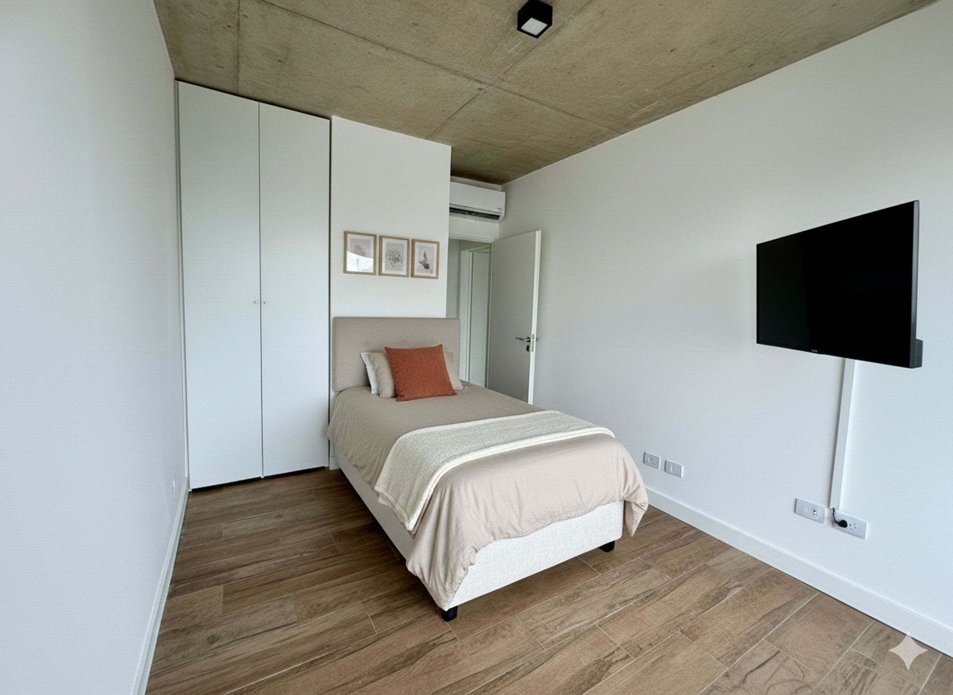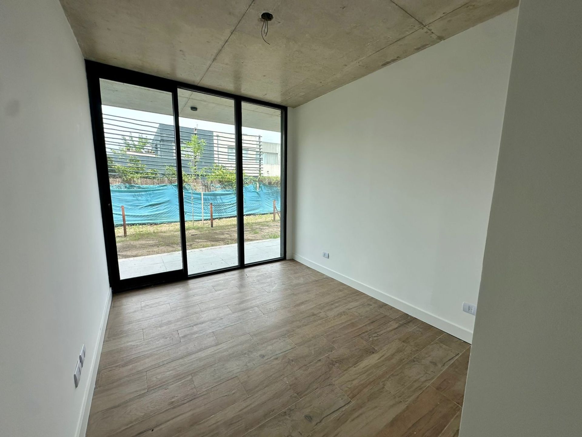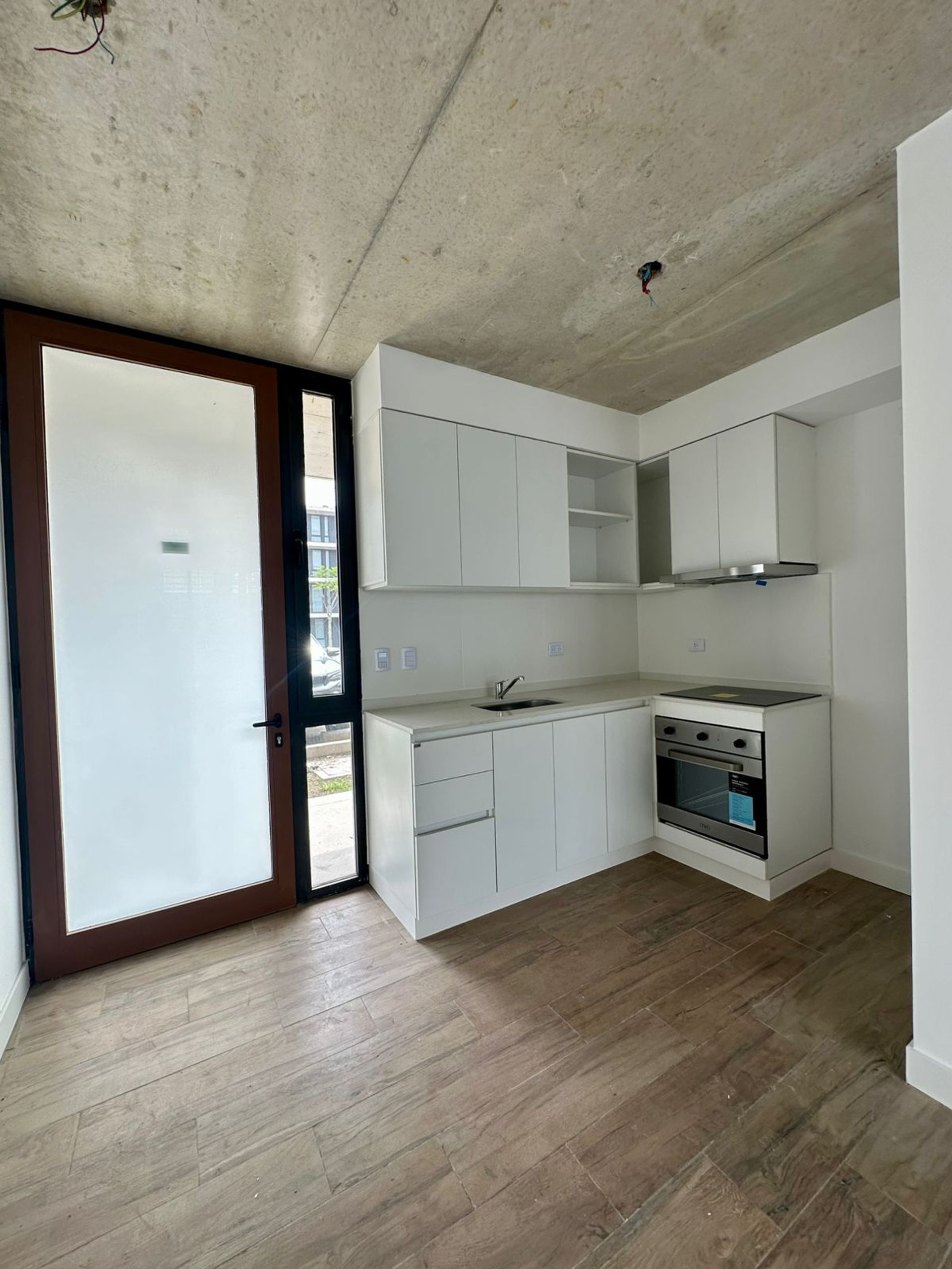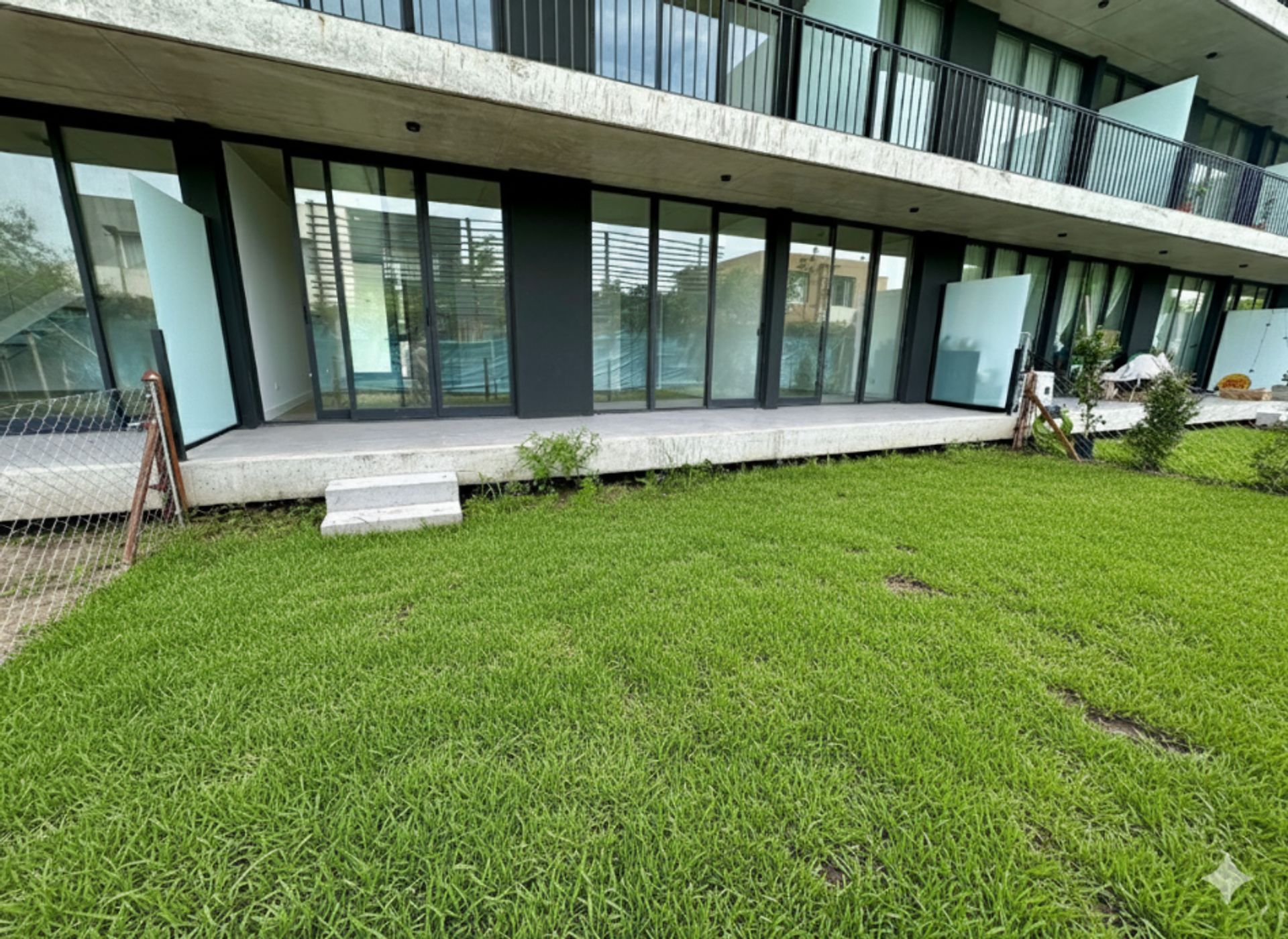 Cada unidad cuenta con tres ambientes, incluyendo un jardín privado recién estrenado que aporta un espacio de relajación al aire libre. El amplio living comedor se integra armoniosamente con una cocina abierta, equipada con muebles de cocina completos, horno, anafe y extractor, todo sobre pisos de porcelanatto de calidad. Los dos dormitorios, uno de ellos en suite, y un baño completo completan la distribución funcional y luminosa del interior. Los armarios con interiores y los aires acondicionados instalados contribuyen al confort térmico y al orden de los espacios. La estructura de techo de hormigón confiere un aspecto moderno y robusto a la fachada.
