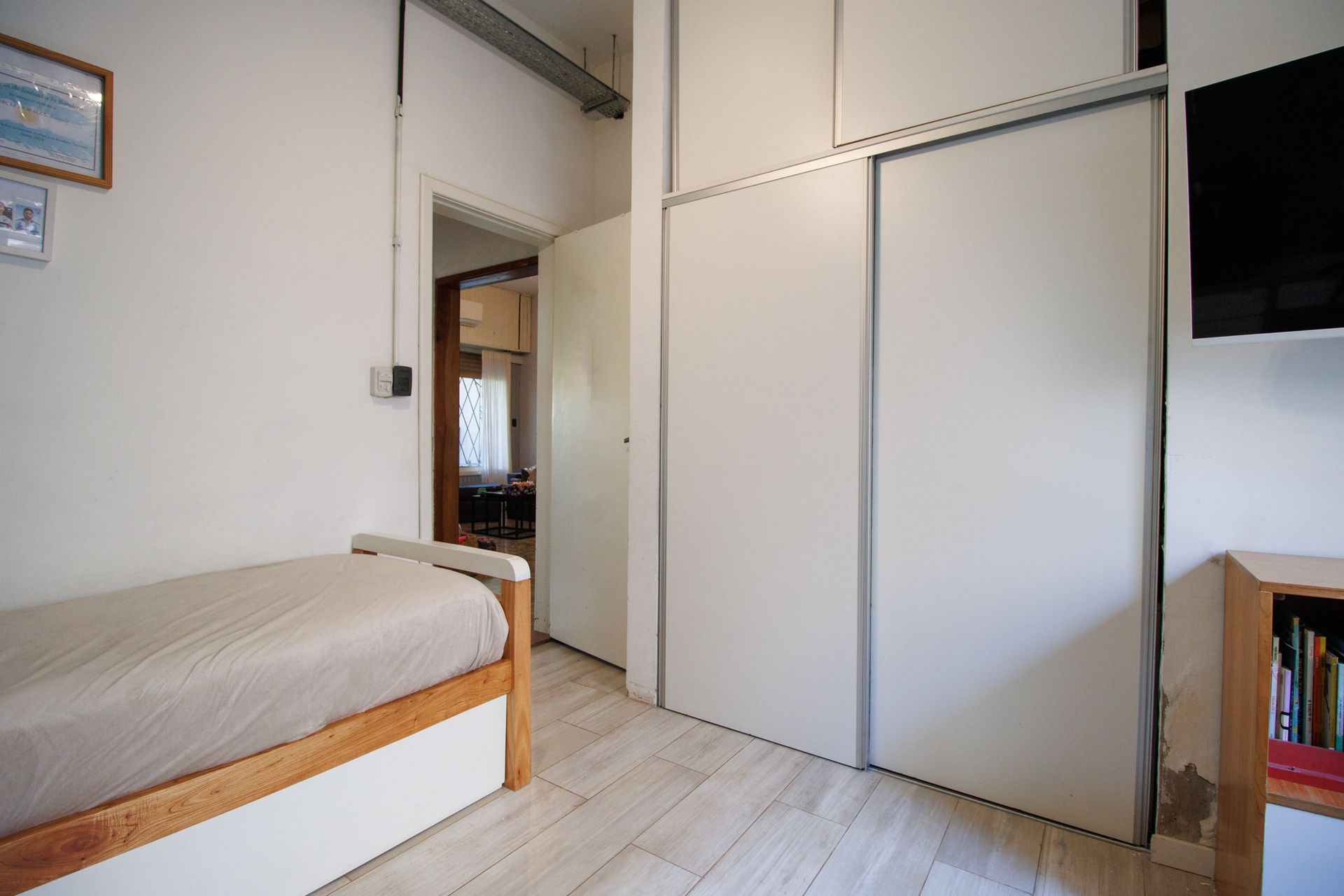 Los artefactos sanitarios son de la marca Ferrum, los revoques interiores en yeso con buña perimetral y las puertas corredizas de los placares con herrajes de aluminio satinados completan un entorno elegante y funcional.